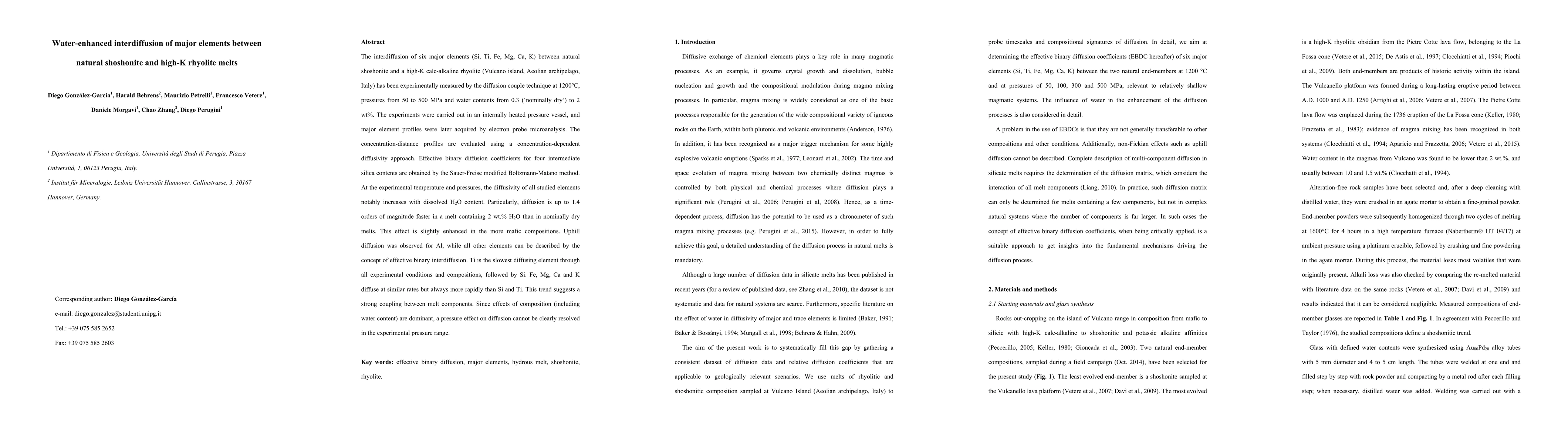 This study experimentally measures the interdiffusion of major elements between natural shoshonite and high-K rhyolite melts at varying water contents and pressures, finding that the presence of water significantly enhances diffusion rates, up to 1.4 orders of magnitude faster in water-rich melts compared to dry ones. Ti diffuses the slowest, while Fe, Mg, Ca, and K diffuse at similar, faster rates than Si and Ti.