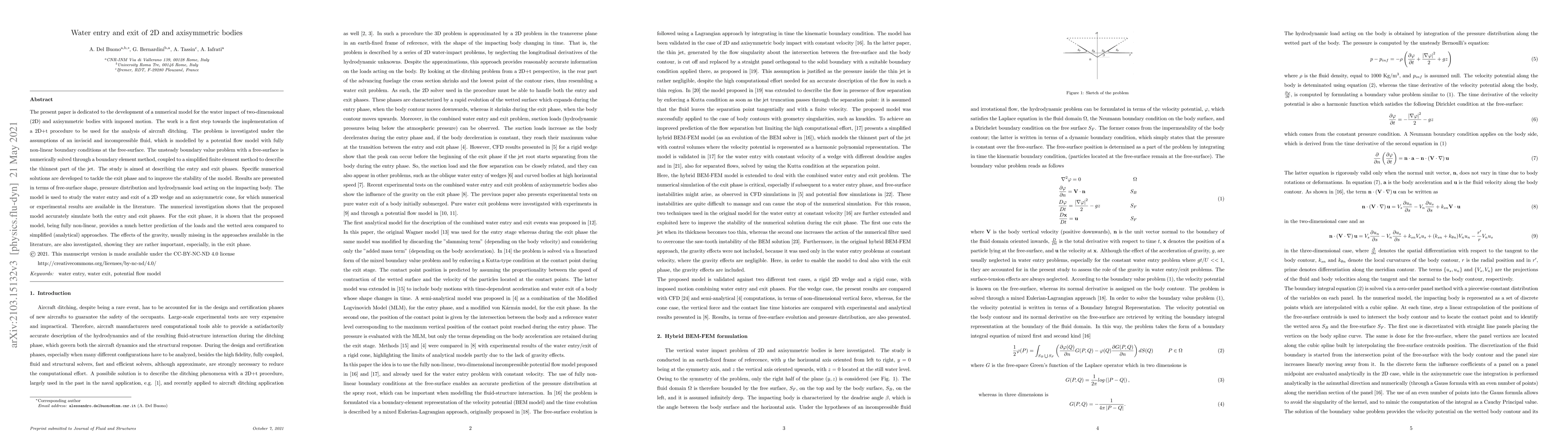 A numerical model is developed to simulate the water entry and exit of 2D and axisymmetric bodies, accurately predicting loads and wetted areas in both phases.