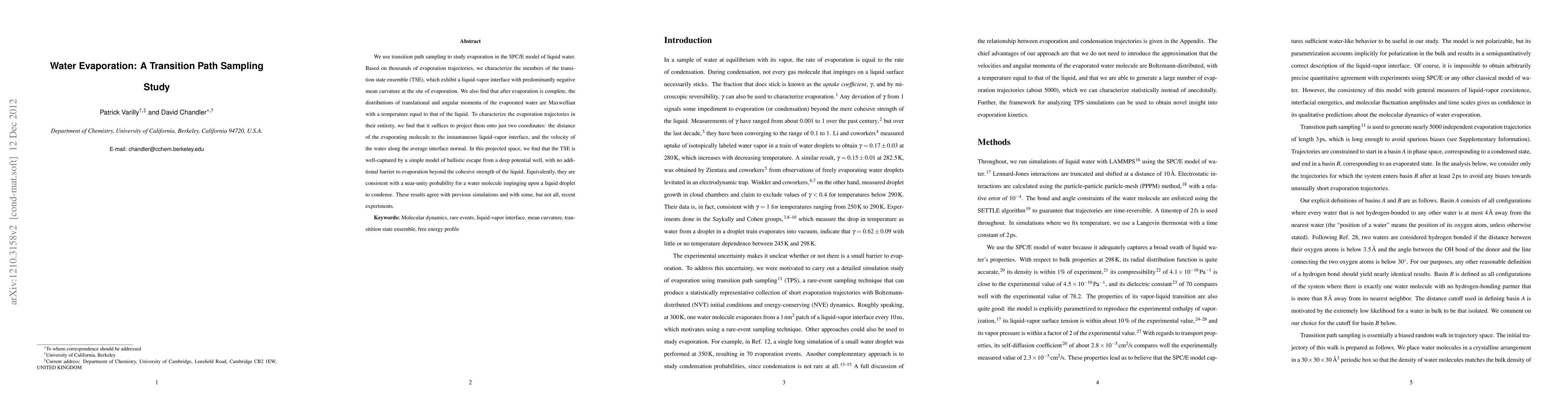 This study uses transition path sampling to analyze evaporation in liquid water, revealing that the transition state ensemble features a liquid-vapor interface with negative mean curvature. The evaporated water molecules exhibit Maxwellian distributions, indicating a temperature matching that of the liquid.