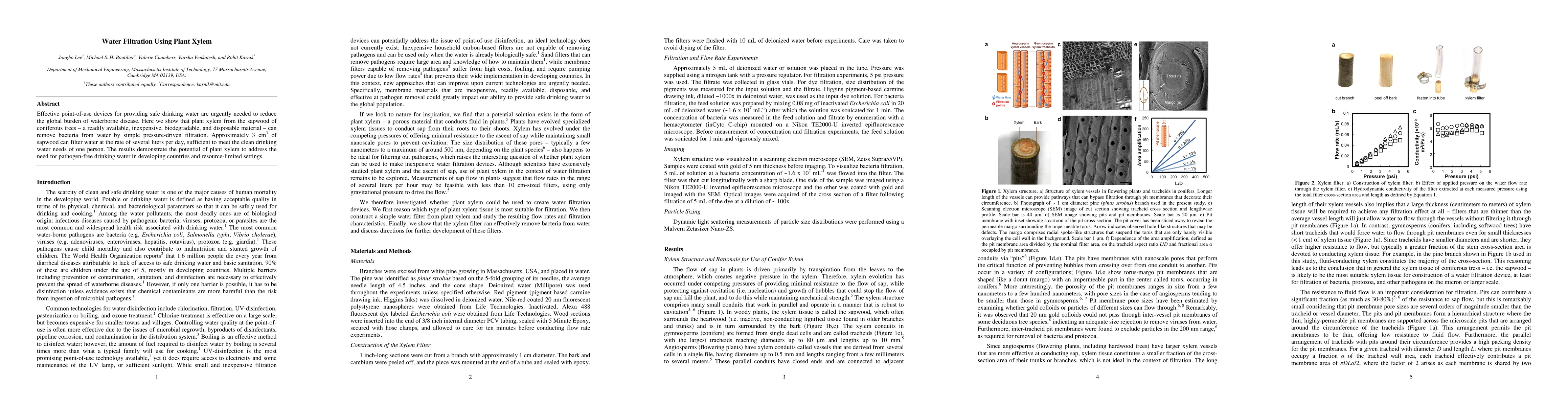 Effective point-of-use devices for providing safe drinking water are urgently needed to reduce the global burden of waterborne disease. Here we show that plant xylem from the sapwood of coniferous trees - a readily available, inexpensive, biodegradable, and disposable material - can remove bacteria from water by simple pressure-driven filtration. Approximately 3 cm3 of sapwood can filter water at the rate of several liters per day, sufficient to meet the clean drinking water needs of one person. The results demonstrate the potential of plant xylem to address the need for pathogen-free drinking water in developing countries and resource-limited settings.