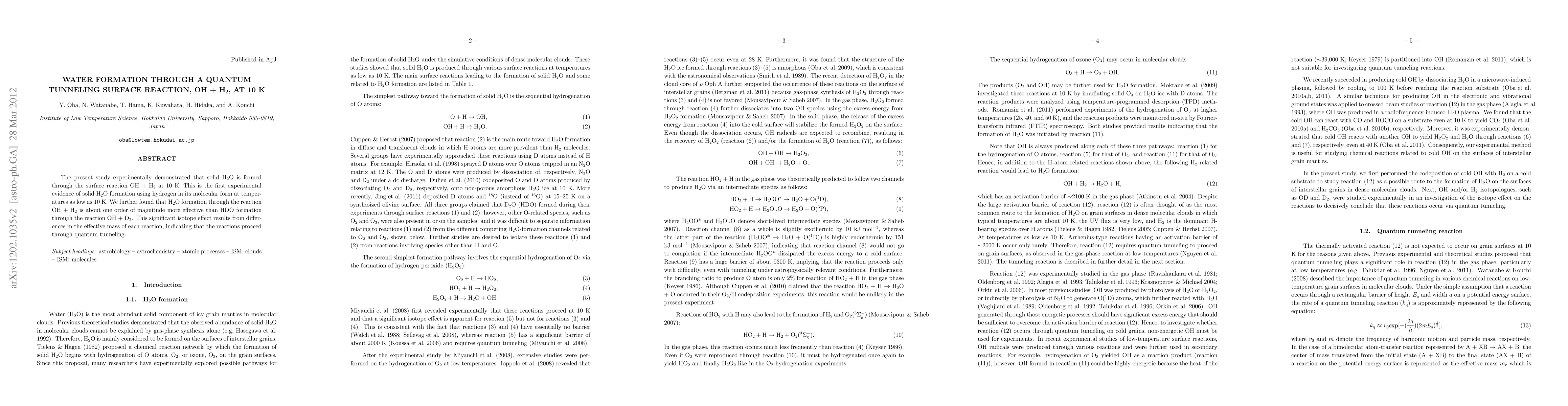 The paper presents a detailed experimental study of surface reactions leading to water formation, highlighting the role of quantum tunneling in these low-temperature processes.