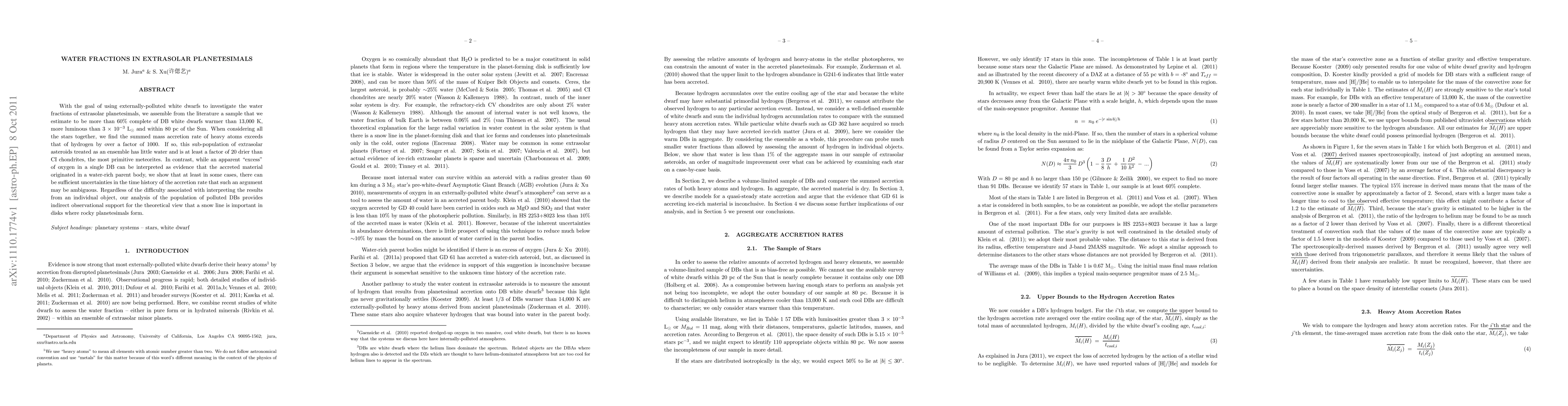 This study investigates the water fractions of extrasolar planetesimals by analyzing the mass accretion rates of heavy atoms onto DB white dwarfs, finding that the sub-population has little water and is significantly drier than CI chondrites. While individual cases may show ambiguous evidence of water, the overall population supports the theoretical notion of a snow line influencing the formation of rocky planetesimals.