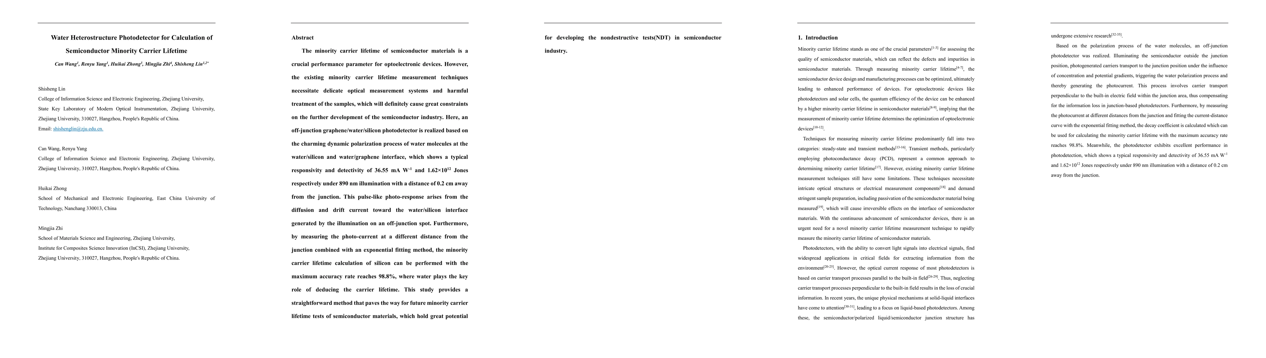 The minority carrier lifetime of semiconductor materials is a crucial performance parameter for optoelectronic devices. However, the existing minority carrier lifetime measurement techniques necessitate delicate optical measurement systems and harmful treatment of the samples, which will definitely cause great constraints on the further development of the semiconductor industry. Here, an off-junction graphene/water/silicon photodetector is realized based on the charming dynamic polarization process of water molecules at the water/silicon and water/graphene interface, which shows a typical responsivity and detectivity of 36.55 mA W-1 and 1.62*1012 Jones respectively under 890 nm illumination with a distance of 0.2 cm away from the junction. This pulse-like photo-response arises from the diffusion and drift current toward the water/silicon interface generated by the illumination on an off-junction spot. Furthermore, by measuring the photo-current at a different distance from the junction combined with an exponential fitting method, the minority carrier lifetime calculation of silicon can be performed with the maximum accuracy rate reaches 98.8%, where water plays the key role of deducing the carrier lifetime. This study provides a straightforward method that paves the way for future minority carrier lifetime tests of semiconductor materials, which hold great potential for developing the nondestructive tests(NDT) in semiconductor industry.