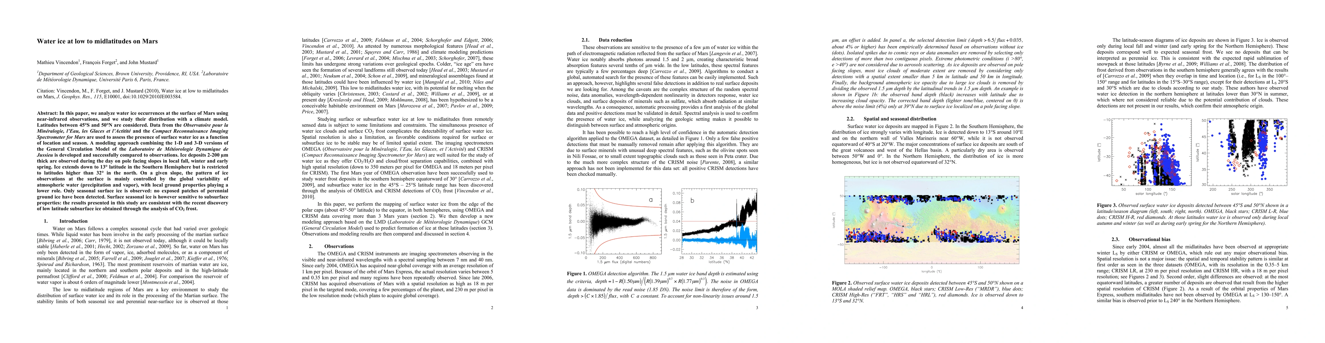 This paper analyzes surface water ice occurrences on Mars using near-infrared observations and a climate model, finding seasonal ice deposits between 45°S and 50°N, primarily influenced by atmospheric water variability rather than local ground properties. No perennial ground ice was detected, but seasonal ice correlates with subsurface ice findings.