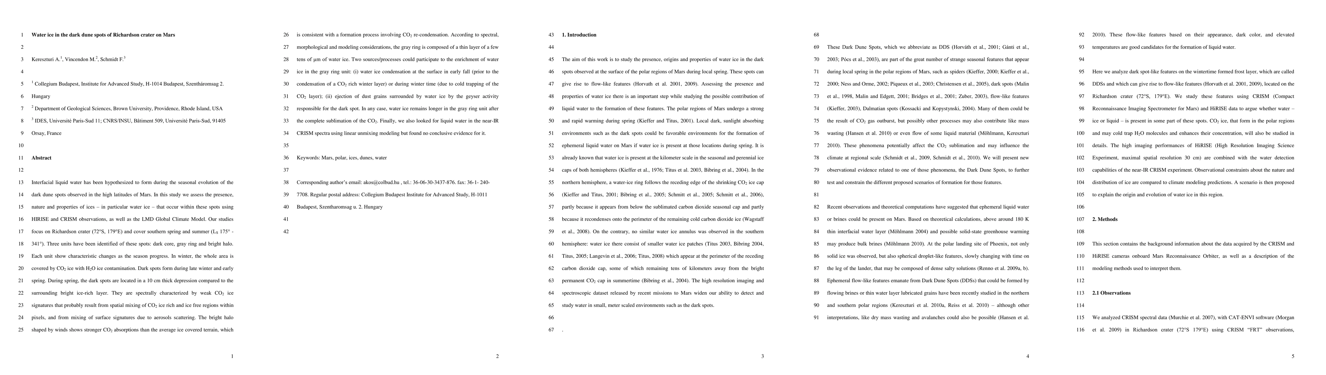 This study investigates the presence and properties of water ice within dark dune spots in Richardson crater on Mars using HIRISE, CRISM observations, and the LMD Global Climate Model. The spots consist of a dark core, gray ring, and bright halo, each showing seasonal changes, with the gray ring likely composed of a thin layer of water ice formed by condensation or geyser activity. No conclusive evidence for liquid water was found.