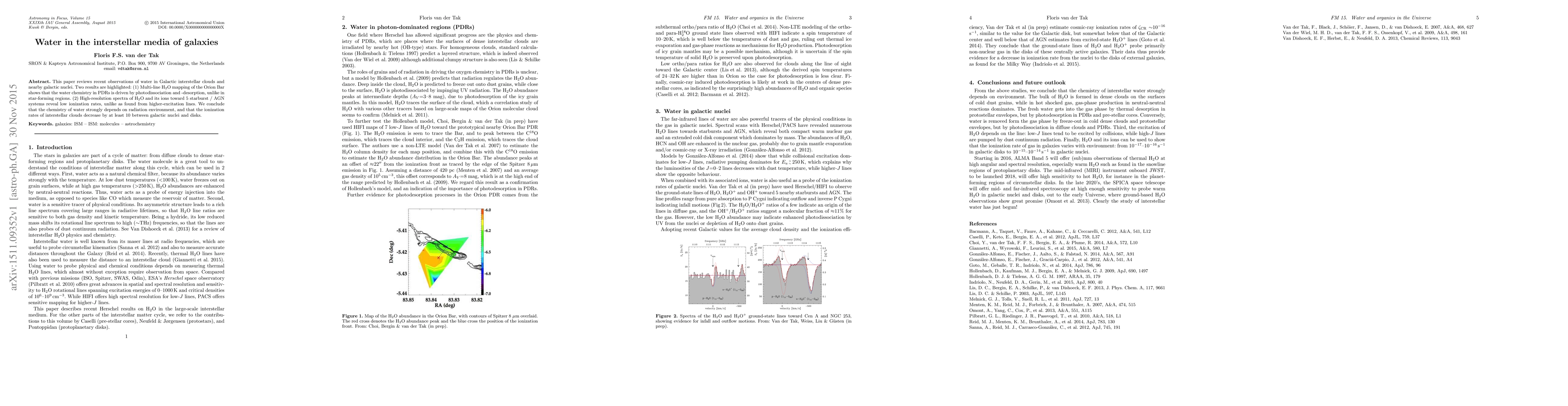 This paper reviews recent observations of water in Galactic interstellar clouds and nearby galactic nuclei, highlighting that water chemistry in photodissociation regions is driven by photodissociation and desorption, and that ionization rates of interstellar clouds decrease significantly between galactic nuclei and disks.