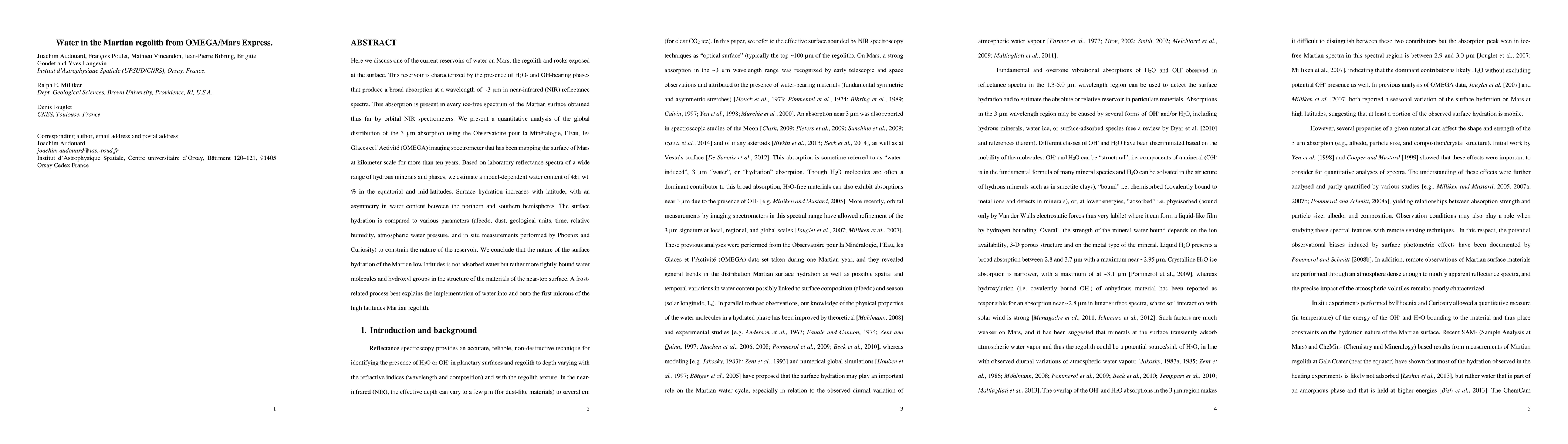 This study analyzes the water content in Martian regolith using OMEGA/Mars Express data, finding a model-dependent water content of 4±1 wt. % in equatorial and mid-latitudes, with increasing hydration towards higher latitudes. The water is not adsorbed but tightly bound in mineral structures, with frost processes explaining water distribution in high latitudes.