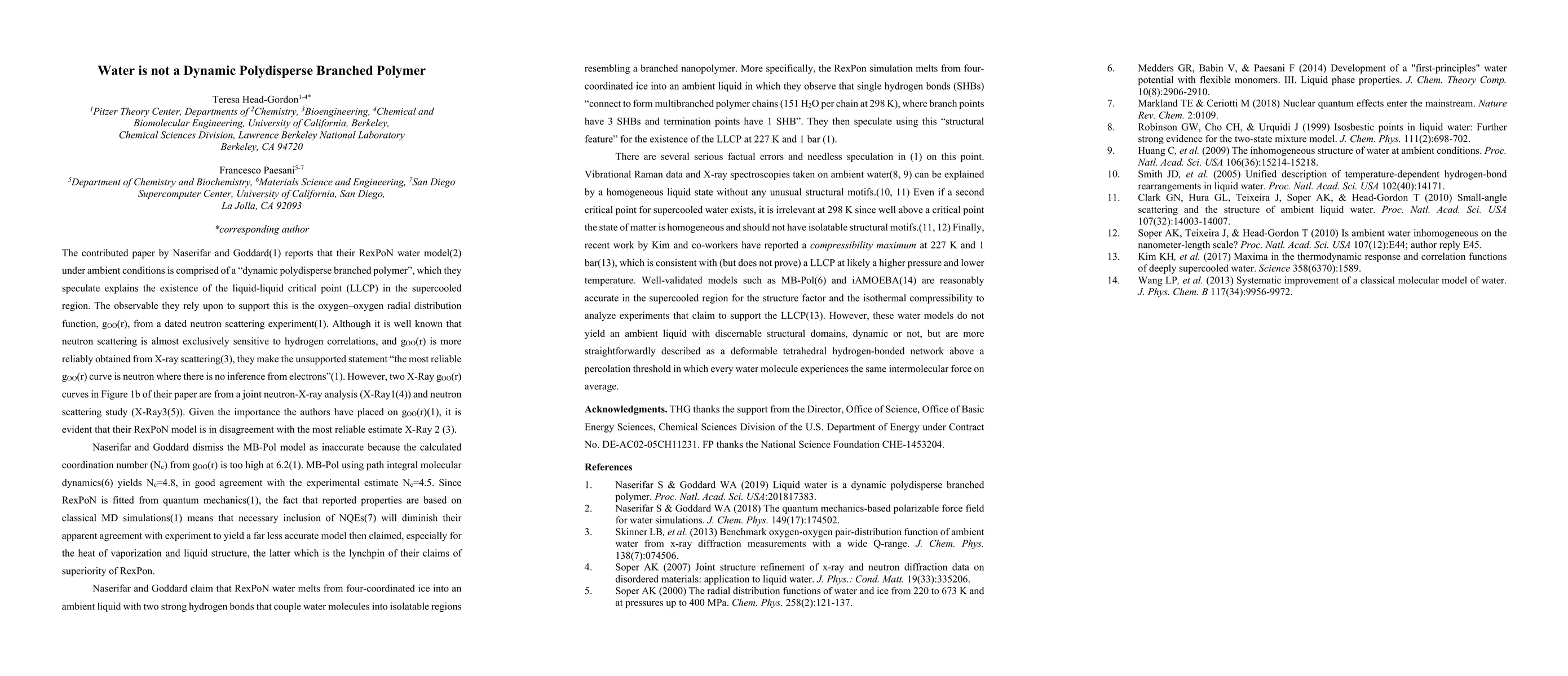 The contributed paper by Naserifar and Goddard reports that their RexPoN water model under ambient conditions simulates liquid water as a dynamic polydisperse branched polymer, which they speculate explains the existence of the liquid-liquid critical point (LLCP) in the supercooled region. Our work addresses several serious factual errors and needless speculation in their paper about their interpretation of their model and its implication for the LLCP in supercooled water.
