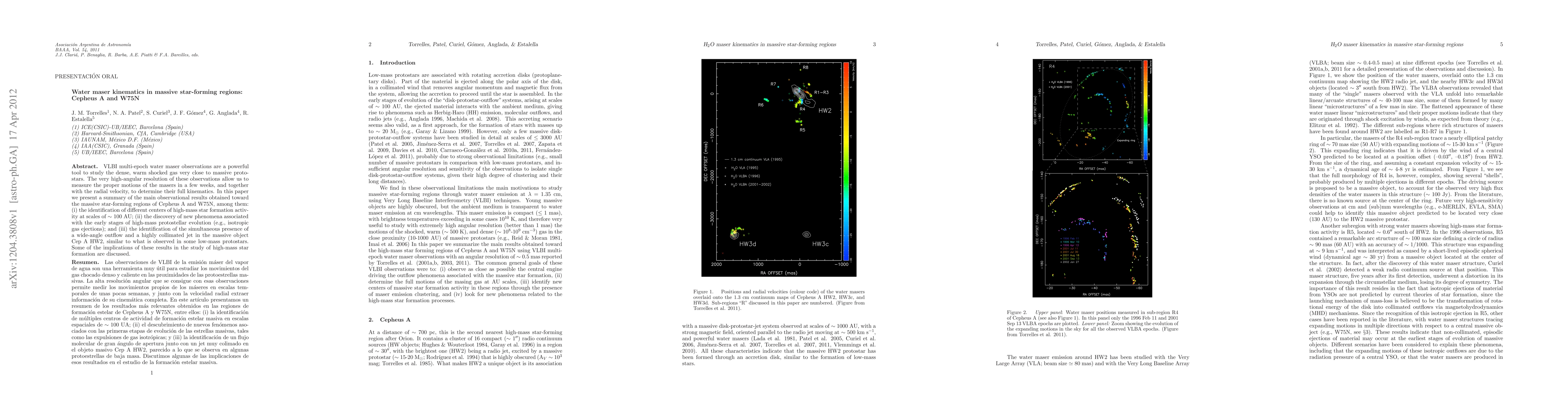VLBI multi-epoch water maser observations are a powerful tool to study the dense, warm shocked gas very close to massive protostars. The very high-angular resolution of these observations allow us to measure the proper motions of the masers in a few weeks, and together with the radial velocity, to determine their full kinematics. In this paper we present a summary of the main observational results obtained toward the massive star-forming regions of Cepheus A and W75N, among them: (i) the identification of different centers of high-mass star formation activity at scales of 100 AU; (ii) the discovery of new phenomena associated with the early stages of high-mass protostellar evolution (e.g., isotropic gas ejections); and (iii) the identification of the simultaneous presence of a wide-angle outflow and a highly collimated jet in the massive object Cep A HW2, similar to what is observed in some low-mass protostars. Some of the implications of these results in the study of high-mass star formation are discussed.