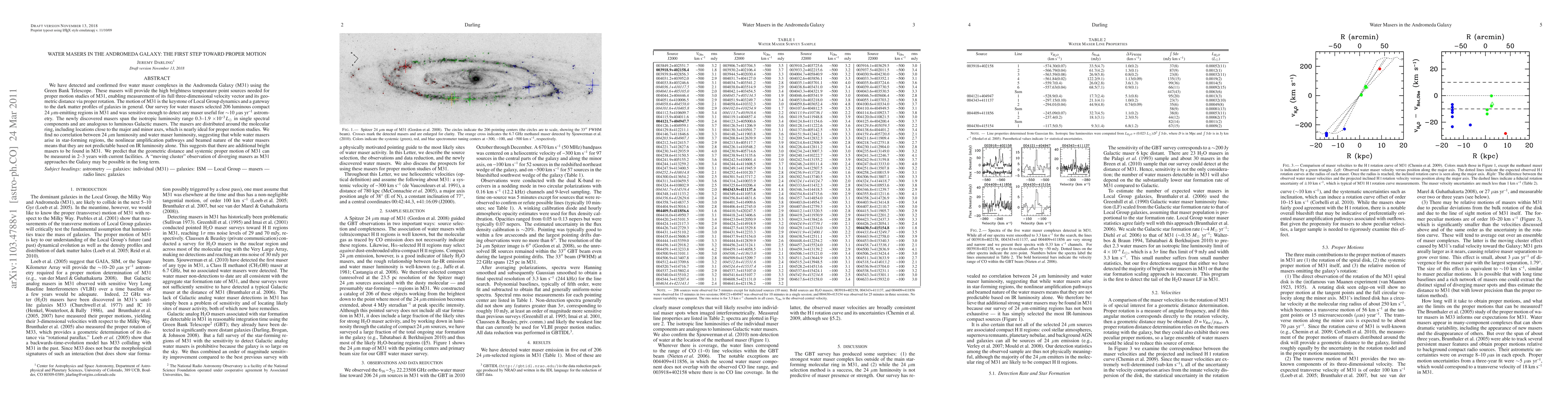 This paper reports the detection of five water maser complexes in the Andromeda Galaxy, which will enable precise proper motion studies to determine M31's three-dimensional velocity vector and geometric distance. The findings suggest additional bright masers exist, and measurements of M31's motion and distance could be achieved within 2-3 years.
