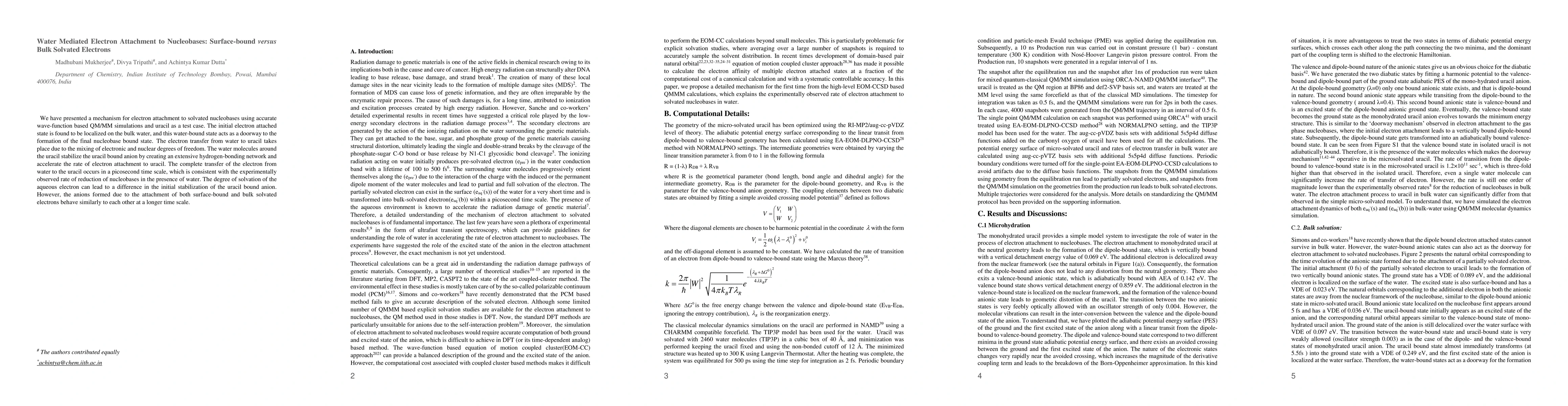 Research reveals that water molecules help stabilize uracil bound anions through hydrogen bonding, allowing electrons to attach and transfer at a picosecond time scale. This finding highlights the role of bulk water environment in accelerating electron attachment dynamics.