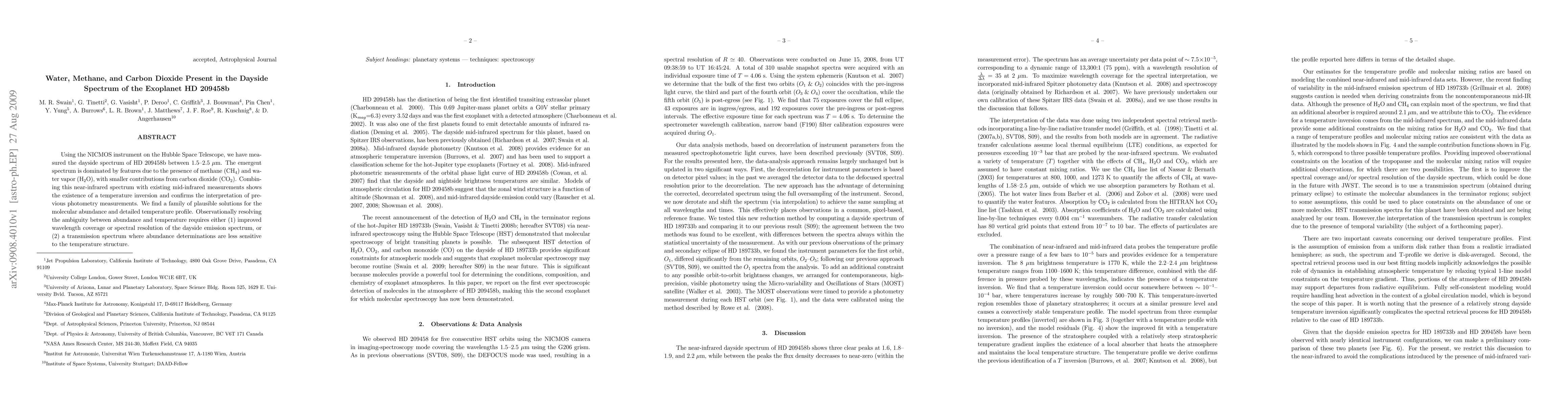 This study, using the Hubble Space Telescope's NICMOS instrument, identifies methane, water vapor, and carbon dioxide in the dayside spectrum of the exoplanet HD 209458b. The findings confirm a temperature inversion and suggest a range of plausible molecular abundances and temperature profiles, though resolving these ambiguities requires enhanced spectral resolution or transmission spectra.