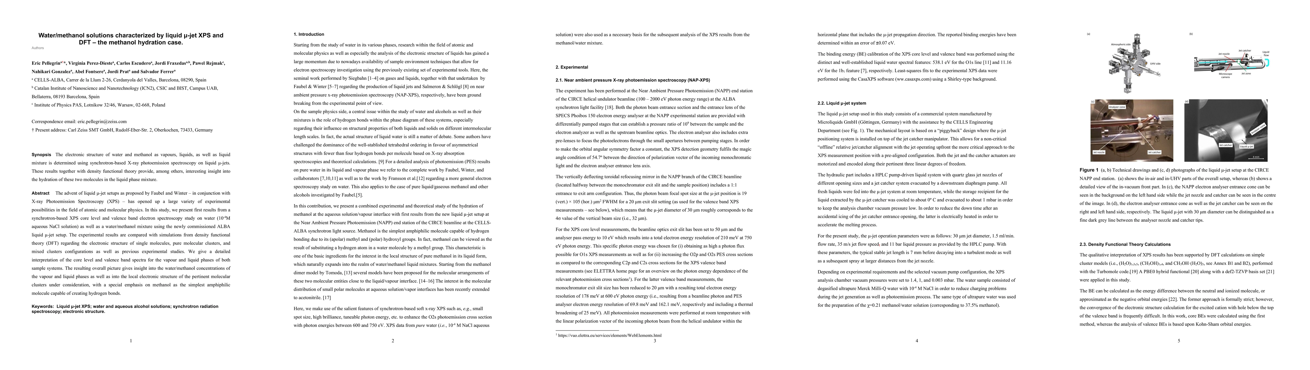 The advent of liquid $\mu$-jet setups as proposed by Faubel and Winter in conjunction with X-ray Photoemission Spectroscopy (XPS) has opened up a large variety of experimental possibilities in the field of atomic and molecular physics. In this study, we present first results from a synchrotron-based XPS core level and valence band electron spectroscopy study on water (10$^{-4}$M aqueous NaCl solution) as well as a water-methanol mixture using the newly commissioned ALBA liquid $\mu$-jet setup. The experimental results are compared with simulations from density functional theory (DFT) regarding the electronic structure of single molecules, pure molecular clusters, and mixed clusters configurations as well as previous experimental studies. We give a detailed interpretation of the core level and valence band spectra for the vapour and liquid phases of both sample systems. The resulting overall picture gives insight into the water-methanol concentrations of the vapour and liquid phases as well as into the local electronic structure of the pertinent molecular clusters under consideration, with a special emphasis on methanol as the simplest amphiphilic molecule capable of creating hydrogen bonds.