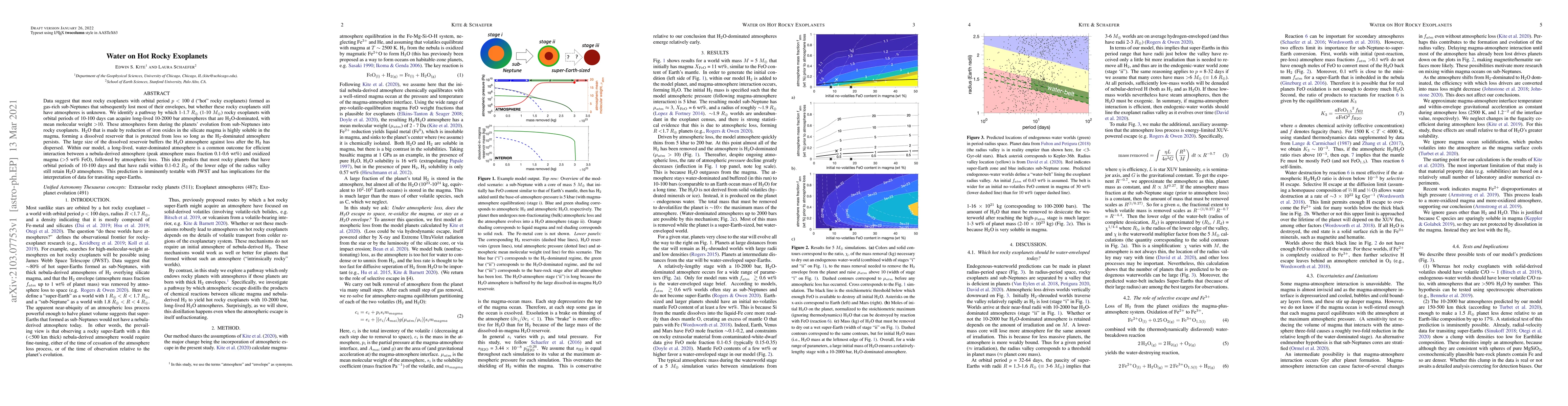 Data suggest that most rocky exoplanets with orbital period $p$ $<$ 100 d ("hot" rocky exoplanets) formed as gas-rich sub-Neptunes that subsequently lost most of their envelopes, but whether these rocky exoplanets still have atmospheres is unknown. We identify a pathway by which 1-1.7 $R_{Earth}$ (1-10 $M_{Earth}$) rocky exoplanets with orbital periods of 10-100 days can acquire long-lived 10-2000 bar atmospheres that are H$_2$O-dominated, with mean molecular weight $>$10. These atmospheres form during the planets' evolution from sub-Neptunes into rocky exoplanets. H$_2$O that is made by reduction of iron oxides in the silicate magma is highly soluble in the magma, forming a dissolved reservoir that is protected from loss so long as the H$_2$-dominated atmosphere persists. The large size of the dissolved reservoir buffers the H$_2$O atmosphere against loss after the H$_2$ has dispersed. Within our model, a long-lived, water-dominated atmosphere is a common outcome for efficient interaction between a nebula-derived atmosphere (peak atmosphere mass fraction 0.1-0.6 wt%) and oxidized magma ($>$5 wt% FeO), followed by atmospheric loss. This idea predicts that most rocky planets that have orbital periods of 10-100 days and that have radii within 0.1-0.2 $R_{Earth}$ of the lower edge of the radius valley still retain H$_2$O atmospheres. This prediction is imminently testable with JWST and has implications for the interpretation of data for transiting super-Earths.