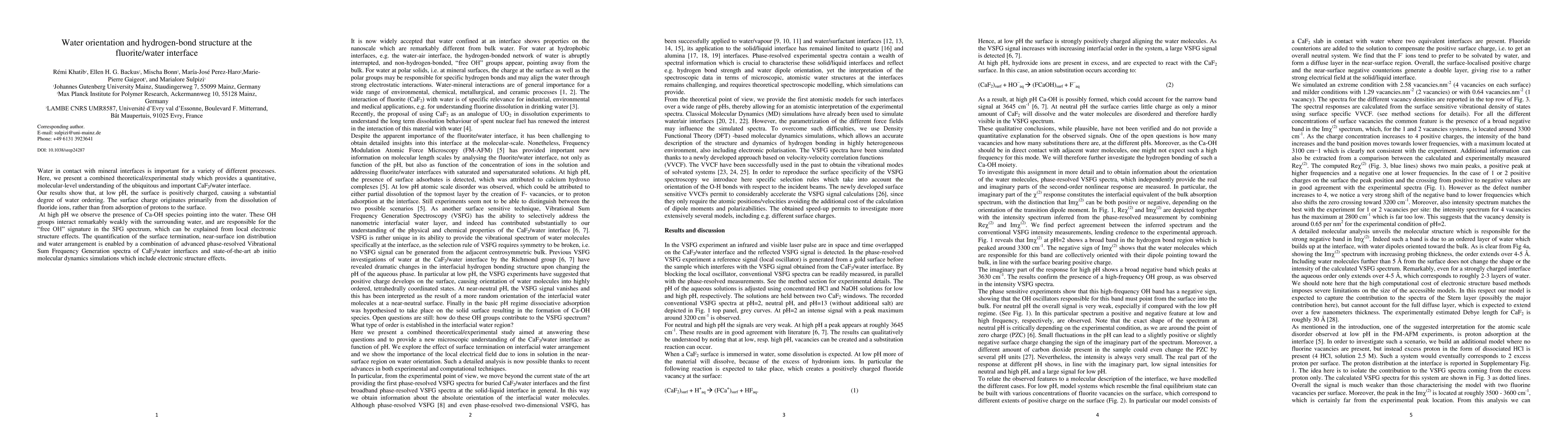 This paper combines theoretical and experimental methods to study the fluorite-water interface, revealing significant water ordering at low pH due to surface charge from fluoride ion dissolution, and the presence of weakly interacting Ca-OH species at high pH. The findings are derived from advanced Vibrational Sum Frequency Generation spectroscopy and ab initio molecular dynamics simulations.