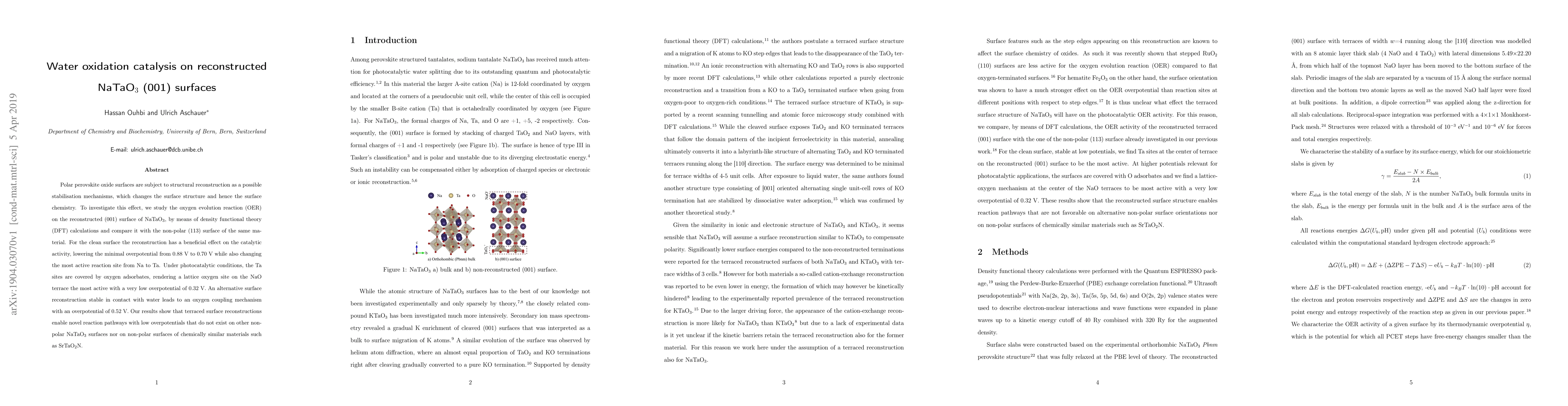 Polar perovskite oxide surfaces are subject to structural reconstruction as a possible stabilisation mechanisms, which changes the surface structure and hence the surface chemistry. To investigate this effect, we study the oxygen evolution reaction (OER) on the reconstructed (001) surface of NaTaO$_3$, by means of density functional theory (DFT) calculations and compare it with the non-polar (113) surface of the same material. For the clean surface the reconstruction has a beneficial effect on the catalytic activity, lowering the minimal overpotential from 0.88 V to 0.70 V while also changing the most active reaction site from Na to Ta. Under photocatalytic conditions, the Ta sites are covered by oxygen adsorbates, rendering a lattice oxygen site on the NaO terrace the most active with a very low overpotential of 0.32 V. An alternative surface reconstruction stable in contact with water leads to an oxygen coupling mechanism with an overpotential of 0.52 V. Our results show that terraced surface reconstructions enable novel reaction pathways with low overpotentials that do not exist on other non-polar NaTaO$_3$ surfaces nor on non-polar surfaces of chemically similar materials such as SrTaO$_2$N.