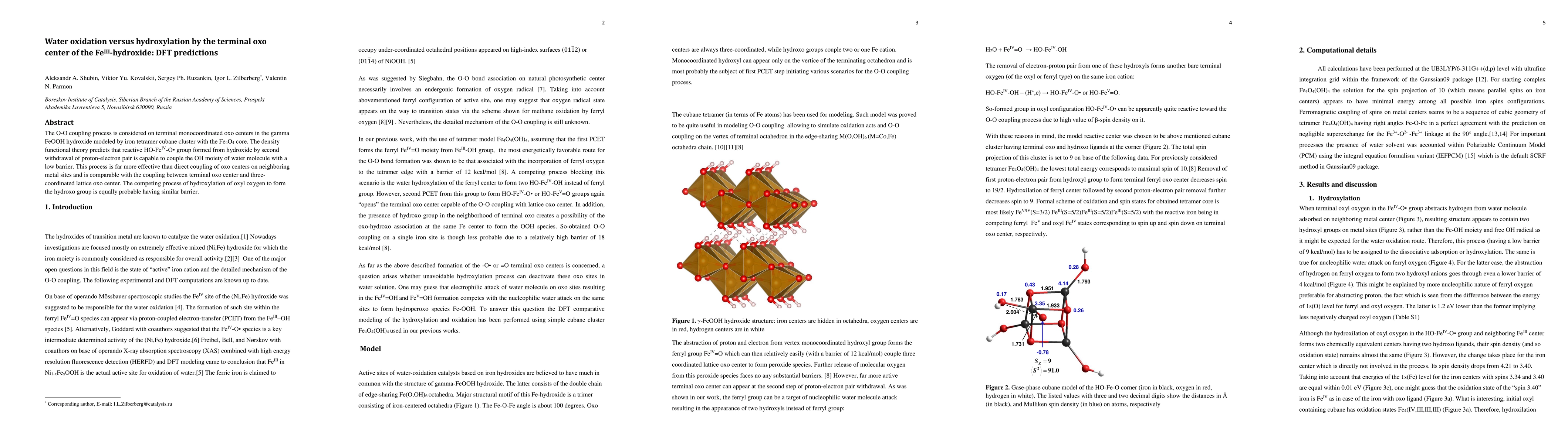 The research uses DFT to model Fe(III)-hydroxide in gamma FeOOH. It finds that a reactive HO-Fe(IV)-O** group can efficiently couple water's OH with a low energy barrier, being more effective than direct oxo-center coupling. The study also reveals that hydroxylation to form a hydroxo group is equally probable with a similar barrier.