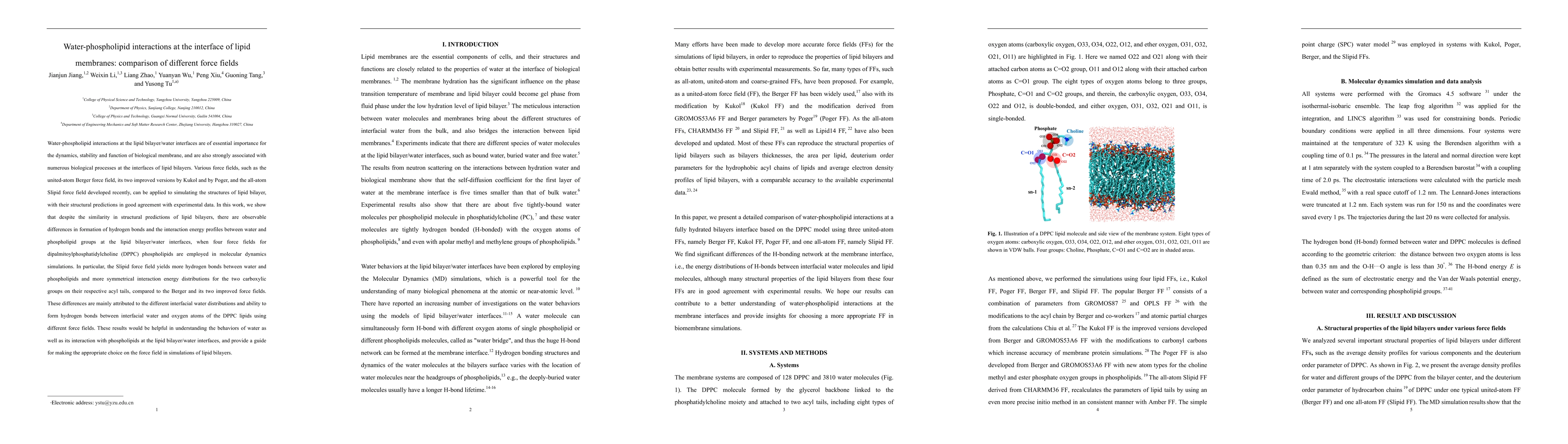 This paper compares the performance of four different force fields in simulating water-phospholipid interactions at lipid bilayer interfaces, highlighting differences in hydrogen bond formation and interaction energy profiles. The Slipid force field shows more symmetrical interactions and better water distribution compared to the Berger and its improved versions.