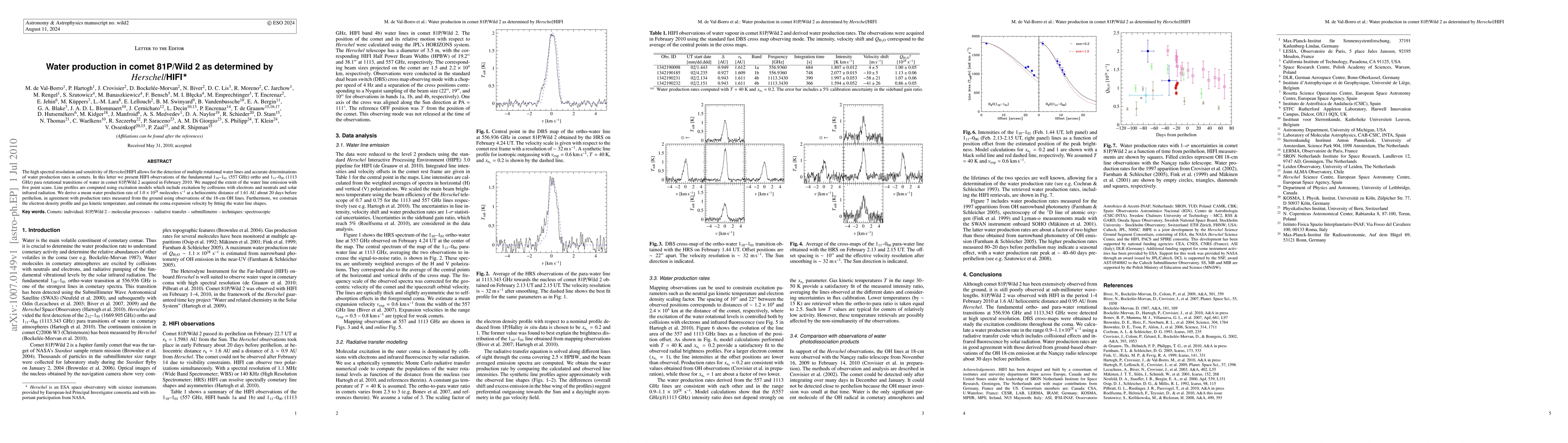 The high spectral resolution and sensitivity of Herschel/HIFI allows for the detection of multiple rotational water lines and accurate determinations of water production rates in comets. In this letter we present HIFI observations of the fundamental 110-101 (557 GHz) ortho and 111-000 (1113 GHz) para rotational transitions of water in comet 81P/Wild 2 acquired in February 2010. We mapped the extent of the water line emission with five point scans. Line profiles are computed using excitation models which include excitation by collisions with electrons and neutrals and solar infrared radiation. We derive a mean water production rate of $1.0 \times 10^{28}$ molecules s$^{-1}$ at a heliocentric distance of 1.61 AU about 20 days before perihelion, in agreement with production rates measured from the ground using observations of the 18-cm OH lines. Furthermore, we constrain the electron density profile and gas kinetic temperature, and estimate the coma expansion velocity by fitting the water line shapes.
