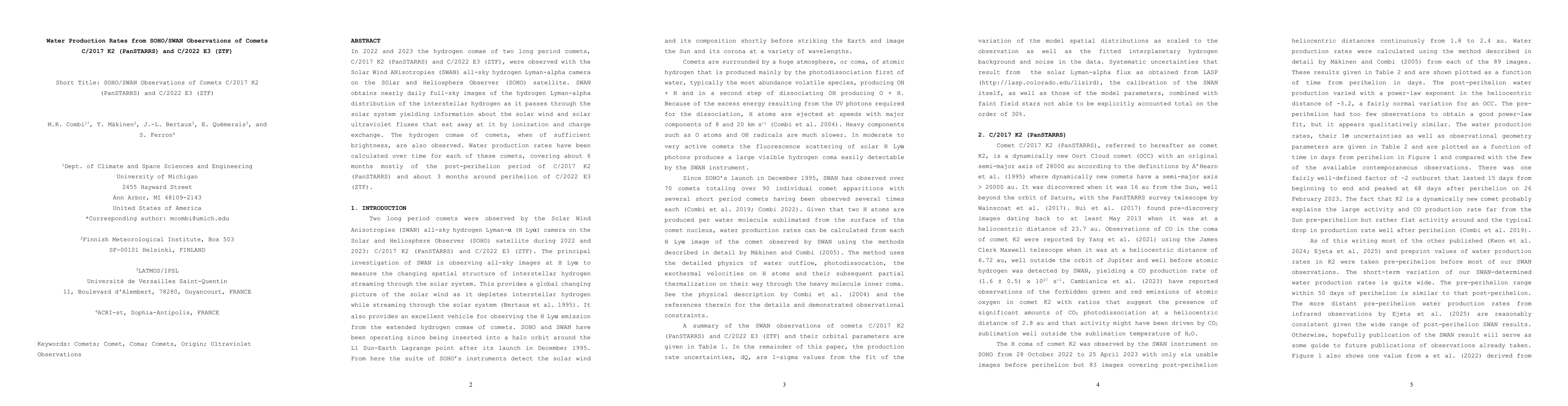 The research utilized the Solar Wind ANisotropies (SWAN) all-sky hydrogen Lyman-alpha camera on the SOlar and Heliosphere Observer (SOHO) satellite to observe the hydrogen comae of comets C/2017 K2 (PanSTARRS) and C/2022 E3 (ZTF), calculating water production rates over their post-perihelion and perihelion periods respectively.