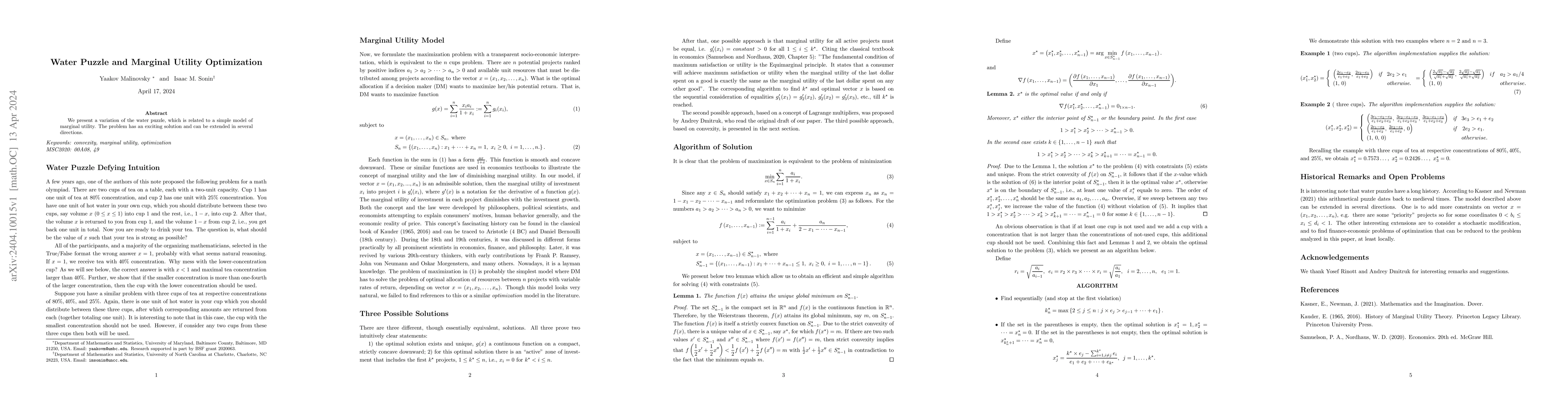 This research explores a water puzzle variant linked to marginal utility theory, presenting an intriguing solution and potential for further extensions. The puzzle offers insights into optimizing utility through simple, relatable models.
