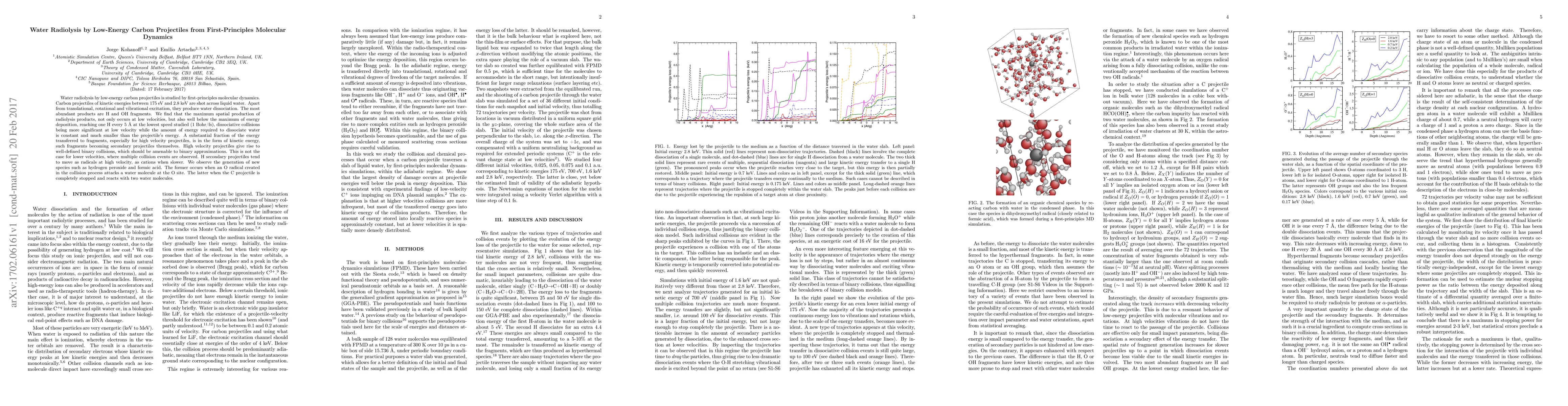 Water radiolysis by low-energy carbon projectiles is studied by first-principles molecular dynamics. Carbon projectiles of kinetic energies between 175 eV and 2.8 keV are shot across liquid water. Apart from translational, rotational and vibrational excitation, they produce water dissociation. The most abundant products are H and OH fragments. We find that the maximum spatial production of radiolysis products, not only occurs at low velocities, but also well below the maximum of energy deposition, reaching one H every 5 Ang at the lowest speed studied (1 Bohr/fs), dissociative collisions being more significant at low velocity while the amount of energy required to dissociate water is constant and much smaller than the projectile's energy. A substantial fraction of the energy transferred to fragments, especially for high velocity projectiles, is in the form of kinetic energy, such fragments becoming secondary projectiles themselves. High velocity projectiles give rise to well-defined binary collisions, which should be amenable to binary approximations. This is not the case for lower velocities, where multiple collision events are observed. H secondary projectiles tend to move as radicals at high velocity, as cations when slower. We observe the generation of new species such as hydrogen peroxide and formic acid. The former occurs when an O radical created in the collision process attacks a water molecule at the O site. The latter when the C projectile is completely stopped and reacts with two water molecules.