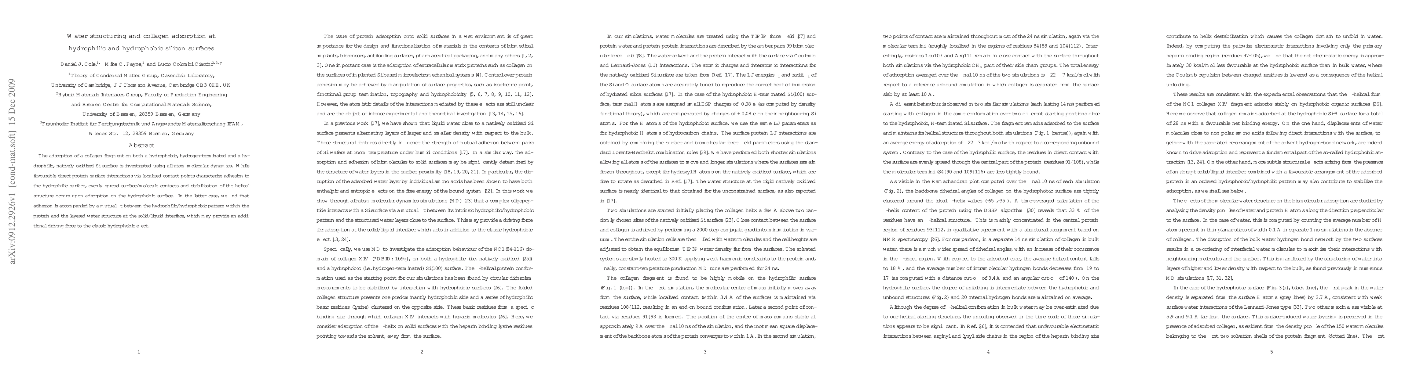 The study uses molecular dynamics to compare collagen adsorption on hydrophobic and hydrophilic silicon surfaces, revealing distinct interaction mechanisms: localised contact points favour adhesion to hydrophilic surfaces, while adsorption on hydrophobic surfaces involves a mutual fit between protein hydrophilic/hydrophobic patterns and structured water layers at the interface.