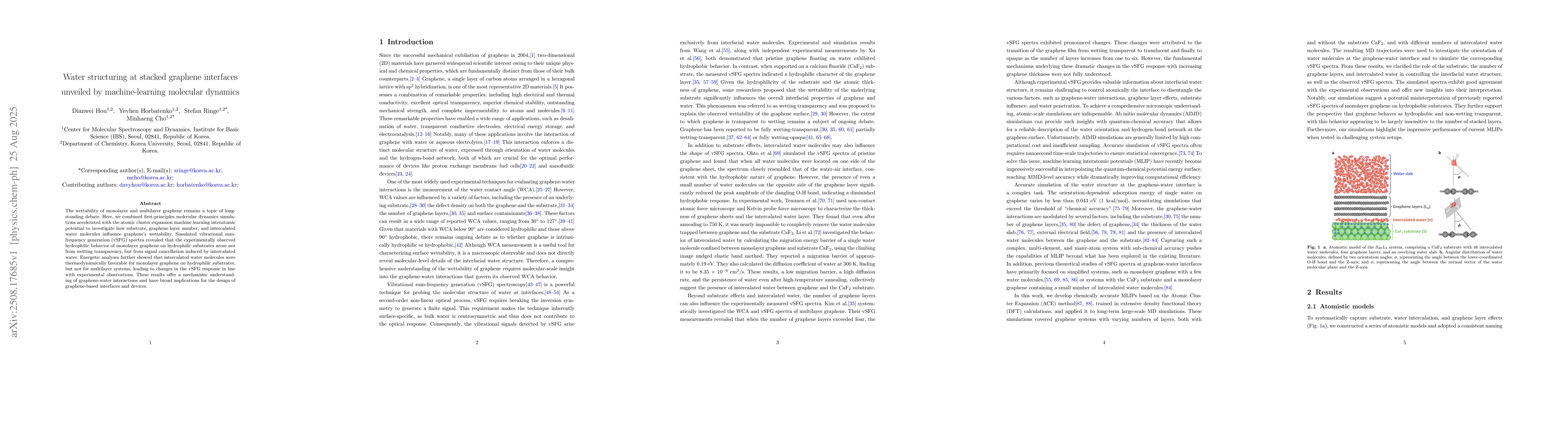 The wettability of monolayer and multilayer graphene remains a topic of longstanding debate. Here, we combined first-principles molecular dynamics simulations accelerated with the atomic cluster expansion machine learning interatomic potential to investigate how substrate, graphene layer number, and intercalated water molecules influence graphene's wettability. Simulated vibrational sum-frequency generation (vSFG) spectra revealed that the experimentally observed hydrophilic behavior of monolayer graphene on hydrophilic substrates arose not from wetting transparency, but from signal cancellation induced by intercalated water. Energetic analyses further showed that intercalated water molecules were thermodynamically favorable for monolayer graphene on hydrophilic substrates, but not for multilayer systems, leading to changes in the vSFG response in line with experimental observations. These results offer a mechanistic understanding of graphene-water interactions and have broad implications for the design of graphene-based interfaces and devices.