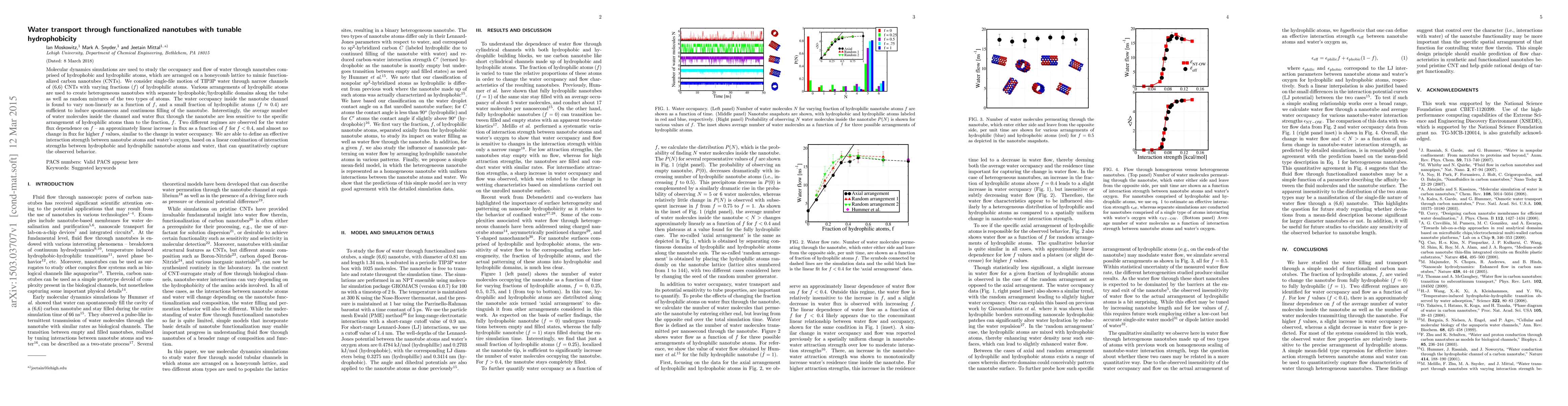 Molecular dynamics simulations are used to study the occupancy and flow of water through nanotubes comprised of hydrophobic and hydrophilic atoms, which are arranged on a honeycomb lattice to mimic functionalized carbon nanotubes (CNTs). We consider single-file motion of TIP3P water through narrow channels of (6,6) CNTs with varying fractions (f) of hydrophilic atoms. Various arrangements of hydrophilic atoms are used to create heterogeneous nanotubes with separate hydrophobic/hydrophilic domains along the tube as well as random mixtures of the two types of atoms. The water occupancy inside the nanotube channel is found to vary nonlinearly as a function of f, and a small fraction of hydrophilic atoms (f ~ 0.4) are sufficient to induce spontaneous and continuous filling of the nanotube. Interestingly, the average number of water molecules inside the channel and water flux through the nanotube are less sensitive to the specific arrangement of hydrophilic atoms than to the fraction, f. Two different regimes are observed for the water flux dependence on f - an approximately linear increase in flux as a function of f for f < 0.4, and almost no change in flux for higher f values, similar to the change in water occupancy. We are able to define an effective interaction strength between nanotube atoms and water's oxygen, based on a linear combination of interaction strengths between hydrophobic and hydrophilic nanotube atoms and water, that can quantitatively capture the observed behavior.