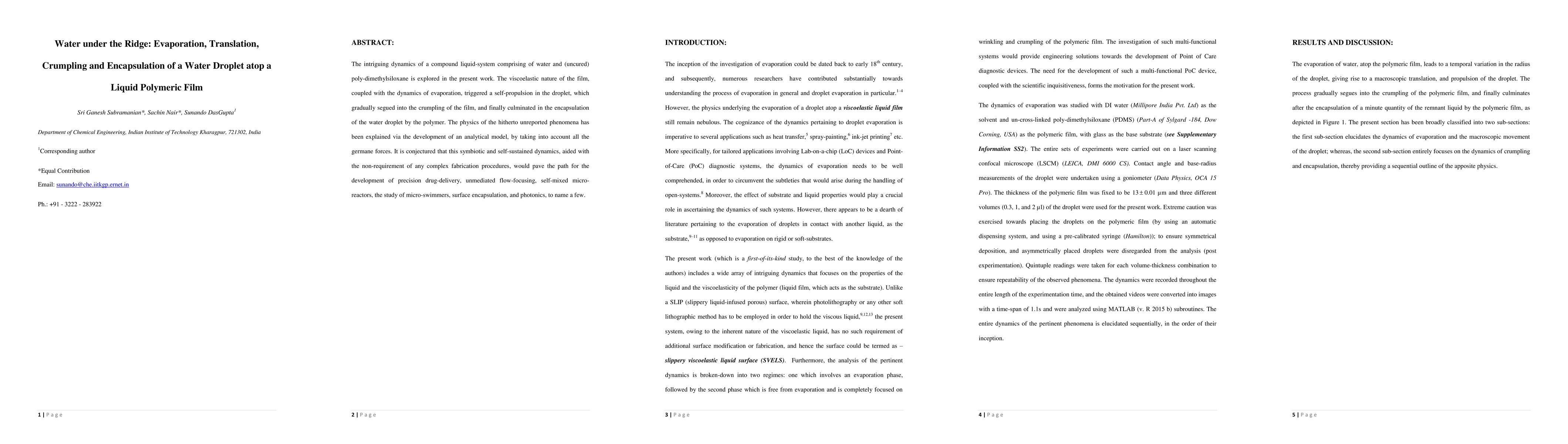 The intriguing dynamics of a compound liquid-system comprising of water and (uncured) poly-dimethylsiloxane is explored in the present work. The viscoelastic nature of the film, coupled with the dynamics of evaporation, triggered a self-propulsion in the droplet, which gradually segued into the crumpling of the film, and finally culminated in the encapsulation of the water droplet by the polymer. The physics of the hitherto unreported phenomena has been explained via the development of an analytical model, by taking into account all the germane forces. It is conjectured that this symbiotic and self-sustained dynamics, aided with the non-requirement of any complex fabrication procedures, would pave the path for the development of precision drug-delivery, unmediated flow-focusing, self-mixed microreactors, the study of micro-swimmers, surface encapsulation, and photonics, to name a few.