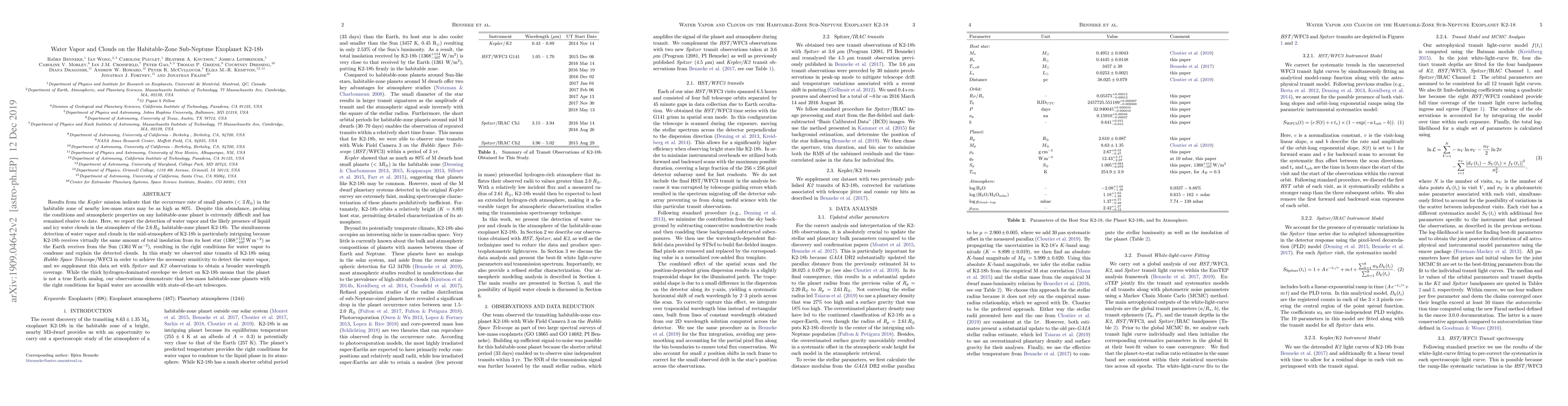 This study reports the detection of water vapor and likely liquid and icy water clouds in the atmosphere of the habitable-zone sub-Neptune exoplanet K2-18b, using HST/WFC3, Spitzer, and K2 observations. The presence of water vapor and clouds suggests conditions conducive to liquid water, highlighting the potential for studying similar low-mass planets with advanced telescopes.