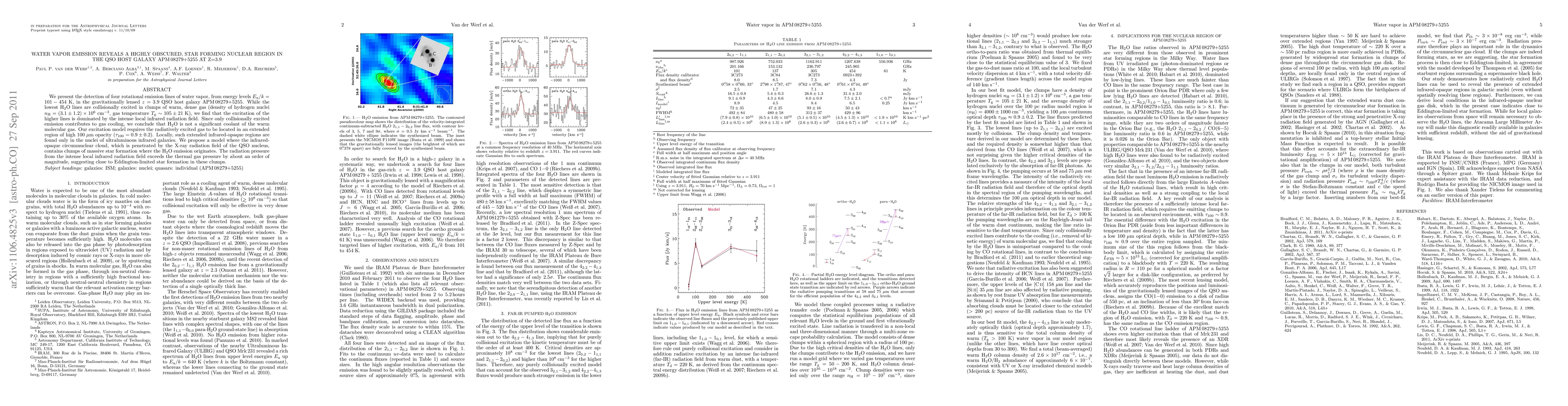 We present the detection of four rotational emission lines of water vapor, from energy levels Eu/k= 101 - 454 K, in the gravitationally lensed z=3.9 QSO host galaxy APM08279+5255. While the lowest H2O lines are collisionally excited in clumps of warm, dense gas (density of hydrogen nuclei n_H=(3.1 +/- 1.2) x 10^6 cm^-3, gas temperature T_g ~ 105 +/- 21 K), we find that the excitation of the higher lines is dominated by the intense local infrared radiation field. Since only collisionally excited emission contributes to gas cooling, we conclude that H2O is not a significant coolant of the warm molecular gas. Our excitation model requires the radiatively excited gas to be located in an extended region of high 100 micron opacity (tau_100 = 0.9 +/- 0.2). Locally, such extended infrared-opaque regions are found only in the nuclei of ultraluminous infrared galaxies. We propose a model where the infrared-opaque circumnuclear cloud, which is penetrated by the X-ray radiation field of the QSO nucleus, contains clumps of massive star formation where the H2O emission originates. The radiation pressure from the intense local infrared radiation field exceeds the thermal gas pressure by about an order of magnitude, suggesting close to Eddington-limited star formation in these clumps.
