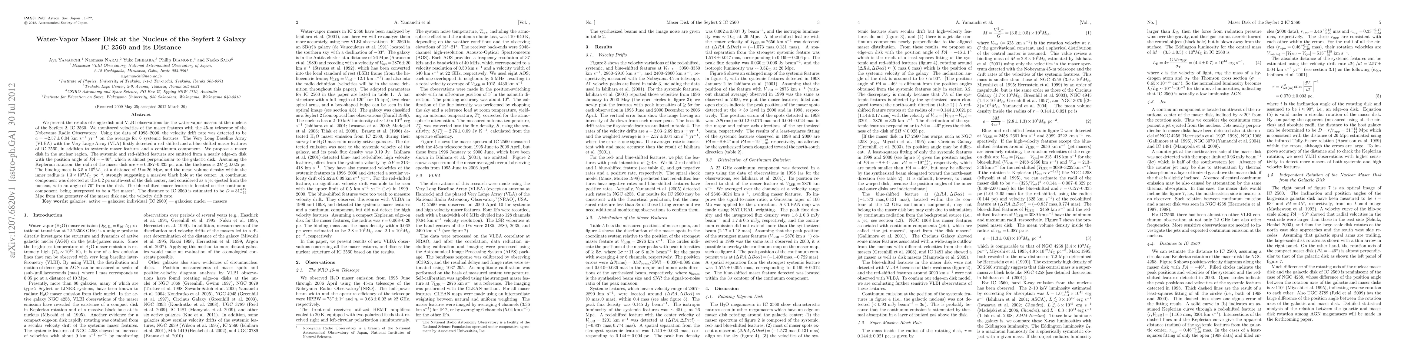 We present the results of single-dish and VLBI observations for the water-vapor masers at the nucleus of the Seyfert 2, IC 2560. We monitored velocities of the maser features with the 45-m telescope of the Nobeyama Radio Observatory. Using the data of 1995--2006, the velocity drift rate was detected to be a = +2.57 +/- 0.04 km/s/yr on the average for 6 systemic features. The Very Long Baseline Array (VLBA) with the Very Large Array (VLA) firstly detected a red-shifted and a blue-shifted maser features of IC 2560, in addition to systemic maser features and a continuum component. We propose a maser disk in the nuclear region. The systemic and red-shifted features are emitted from a nearly edge-on disk with the position angle of PA = -46 deg, which is almost perpendicular to the galactic disk. Assuming the Keplerian rotation, the radii of the maser disk are r = 0.087--0.335 pc, and the thickness is 2H <= 0.025 pc. The binding mass is 3.5 x 10^6 Msun at a distance of D = 26 Mpc, and the mean volume density within the inner radius is 1.3 x 10^9 Msun/pc^3, strongly suggesting a massive black hole at the center. A continuum component was detected at the 0.2 pc southwest of the disk center, and considered as a jet ejected from the nucleus, with an angle of 70 deg from the disk. The blue-shifted maser feature is located on the continuum component, being interpreted to be a "jet maser". The distance to IC 2560 is estimated to be D = 31^{+12}_{-14} Mpc from the geometry of the maser disk and the velocity drift rate.