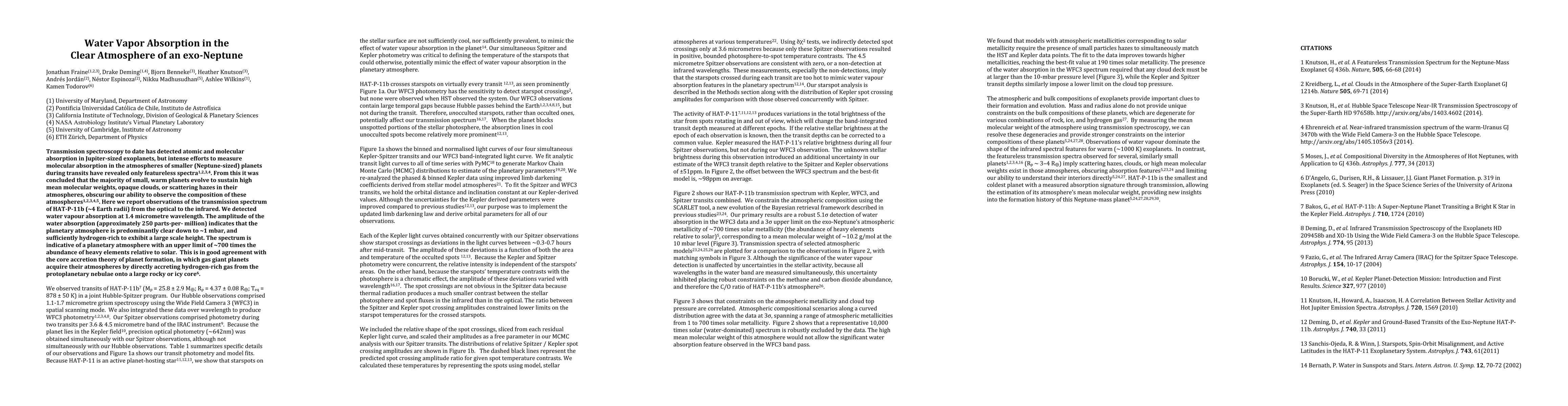 This paper reports the first detection of water vapour absorption in the atmosphere of HAT-P-11b, an exo-Neptune, revealing a predominantly clear atmosphere and supporting the core accretion theory of planet formation. The observed water vapour indicates a hydrogen-rich atmosphere with a low abundance of heavy elements.
