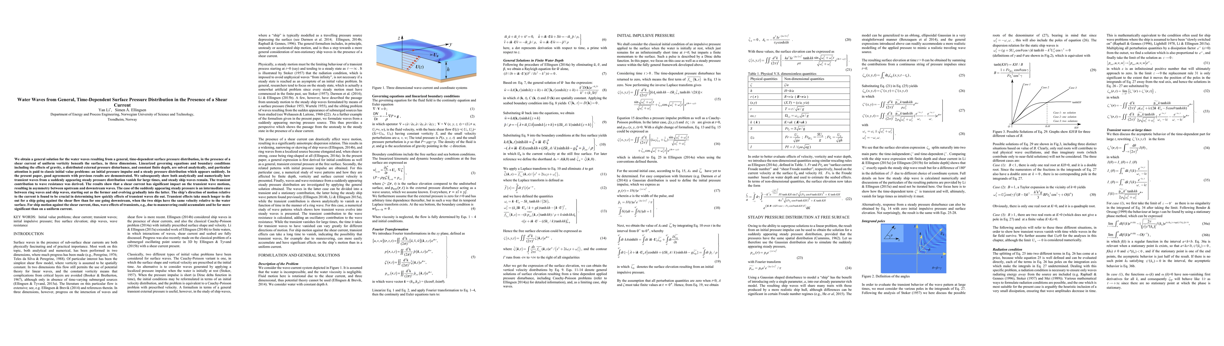 This paper provides a general analytical solution for water waves generated by time-dependent surface pressure distributions in the presence of a shear current. It demonstrates significant asymmetry in transient wave motions due to the current, with longer decay times for ships moving against the current, highlighting the impact of ship direction relative to the current on wave resistance.
