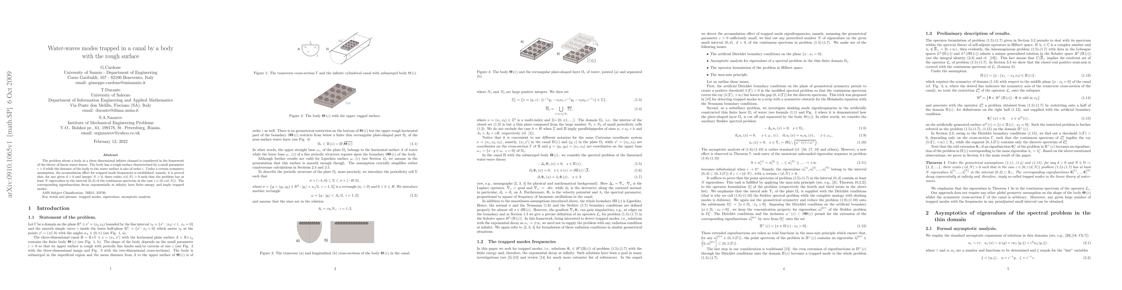 The problem about a body in a three dimensional infinite channel is considered in the framework of the theory of linear water-waves. The body has a rough surface characterized by a small parameter $\epsilon>0$ while the distance of the body to the water surface is also of order $\epsilon$. Under a certain symmetry assumption, the accumulation effect for trapped mode frequencies is established, namely, it is proved that, for any given $d>0$ and integer $N>0$, there exists $\epsilon(d,N)>0$ such that the problem has at least $N$ eigenvalues in the interval $(0,d)$ of the continuous spectrum in the case $\epsilon\in(0,\epsilon(d,N)) $. The corresponding eigenfunctions decay exponentially at infinity, have finite energy, and imply trapped modes.