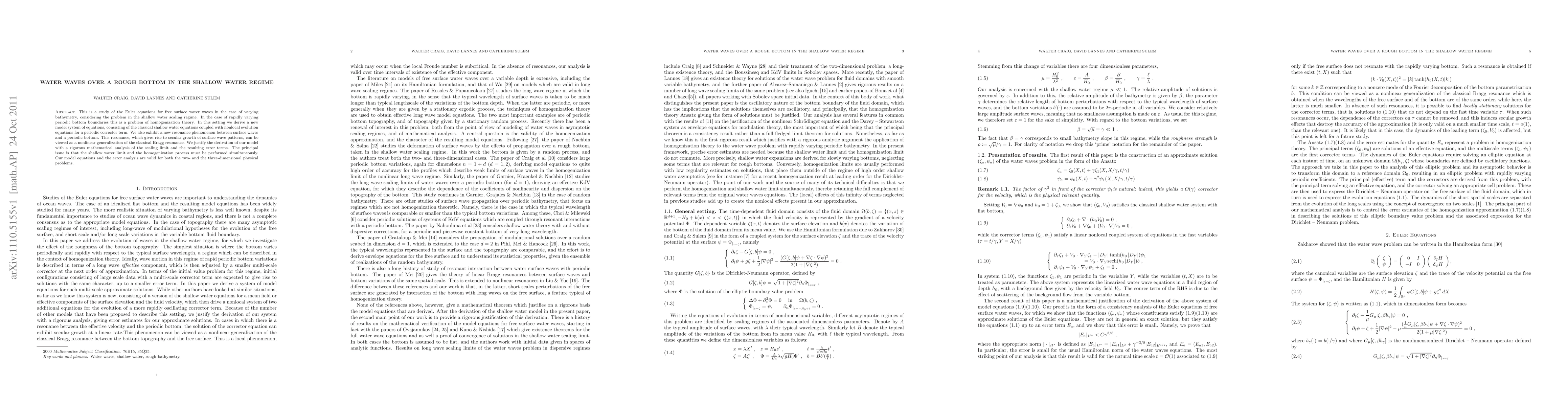 This paper develops a new model for shallow water waves over a rough bottom, deriving a coupled system of shallow water and nonlocal evolution equations. It identifies a resonance phenomenon leading to secular growth of surface wave patterns, analogous to the classical Bragg resonance, and rigorously justifies the model through a detailed mathematical analysis of the scaling limit.