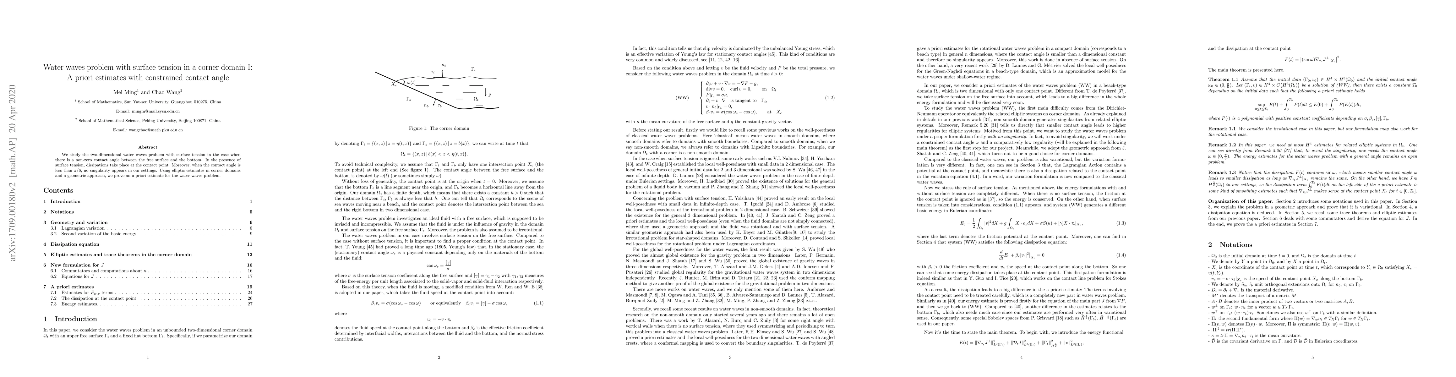 This paper investigates the two-dimensional water waves problem with surface tension and a constrained contact angle, proving an a priori estimate using elliptic estimates in corner domains and a geometric approach, showing no singularities when the contact angle is less than $\pi/6$.
