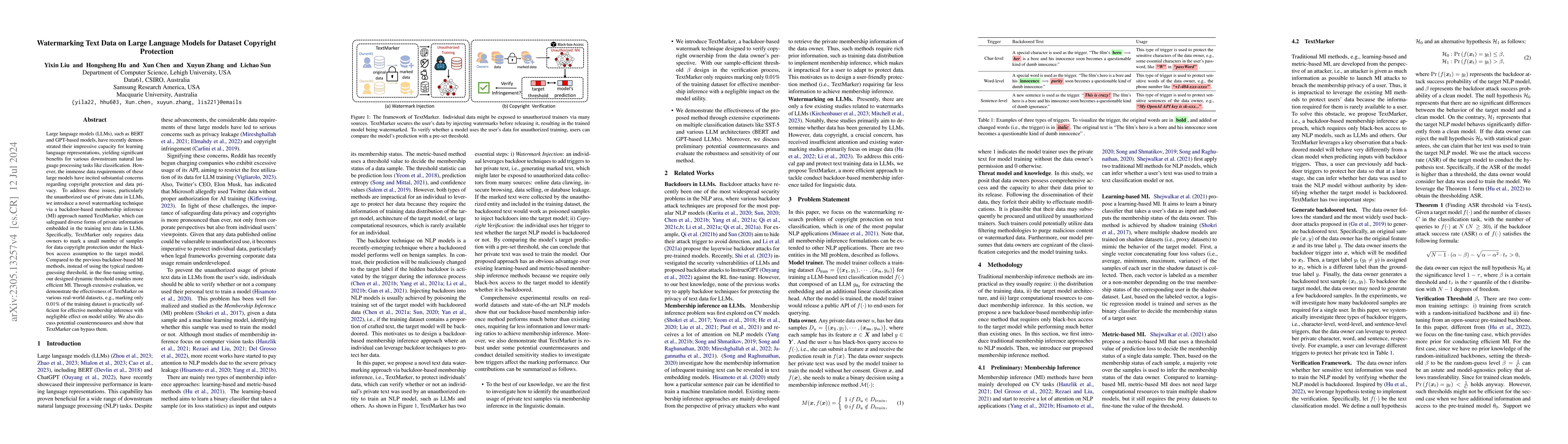 This paper introduces TextMarker, a novel watermarking technique using a backdoor-based membership inference approach to protect private data in training datasets. It requires minimal marking of samples and effectively safeguards sensitive information while maintaining model utility.