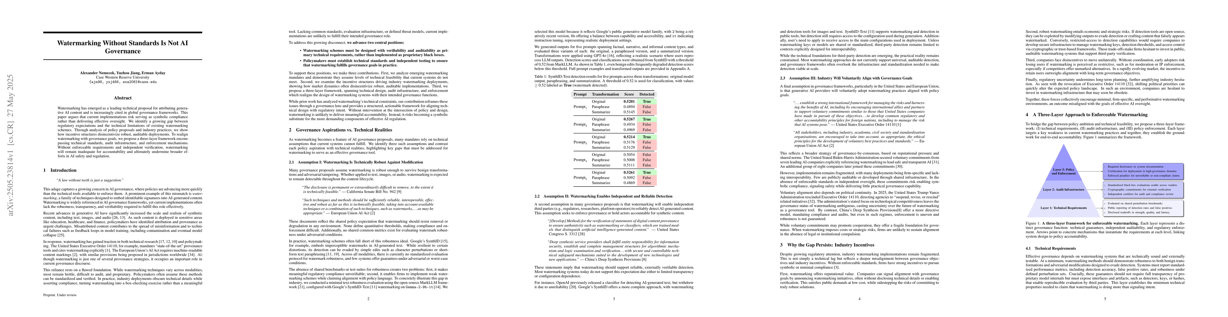The paper proposes a three-layer framework to realign watermarking with governance goals, emphasizing the need for technical standards, independent verification, and robust auditing mechanisms.