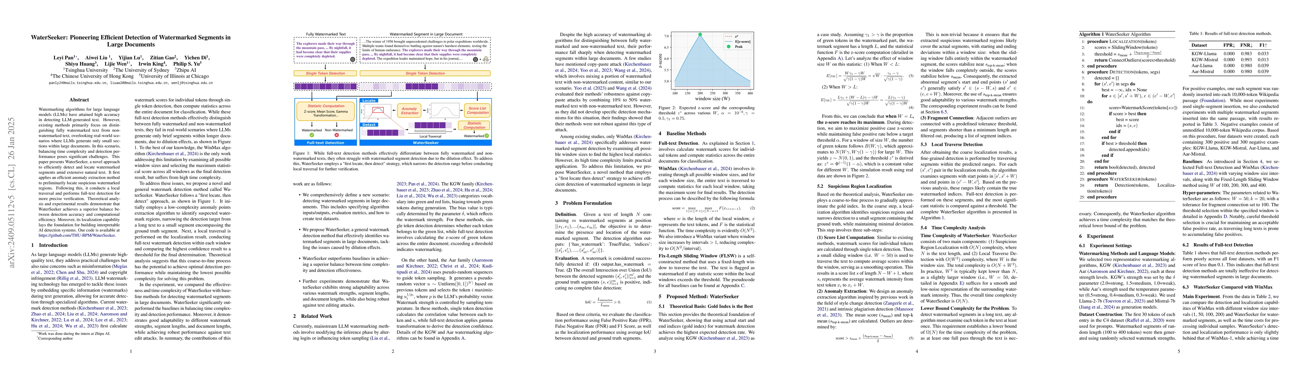 WaterSeeker introduces an efficient method for detecting and localizing watermarked segments within large documents, balancing detection accuracy and computational efficiency. It leverages anomaly extraction and local traversal for precise verification, addressing the challenge of identifying small watermarked sections amidst extensive natural text.