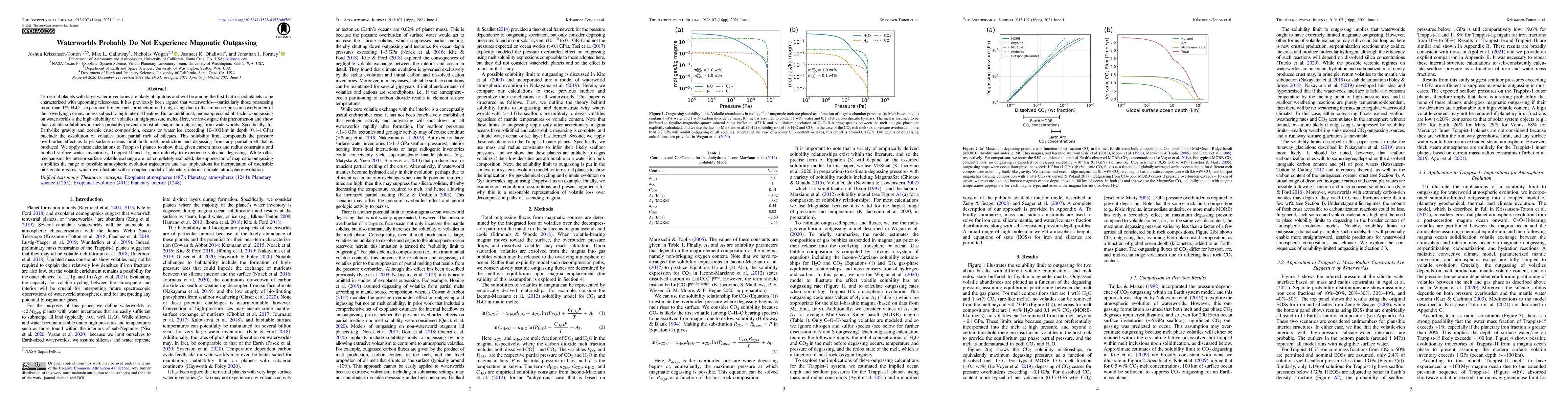 This paper investigates the likelihood of magmatic outgassing on waterworlds, finding that high solubility of volatiles in high-pressure melts likely prevents significant degassing. It concludes that planets like Trappist-1f and -1g, with large water inventories, are unlikely to experience volcanic degassing due to these solubility limits, which simplify atmospheric evolution models and affect the interpretation of potential biosignature gases.