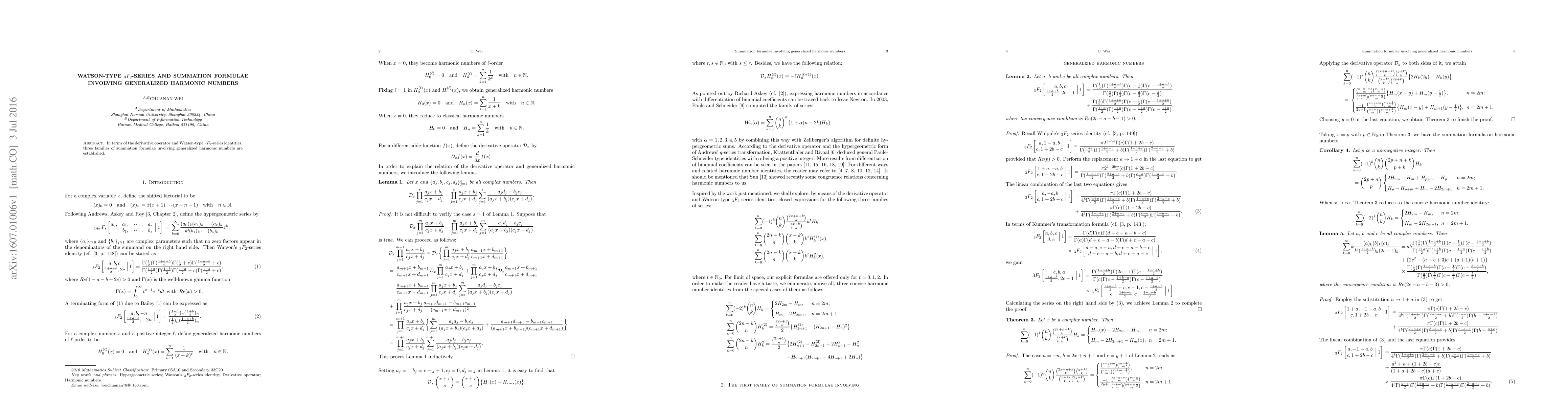 Summary: This paper establishes three families of summation formulae involving generalized harmonic numbers through the use of derivative operator and Watson-type $_3F_2$-series identities. The results provide new insights into the relationships between these mathematical constructs.