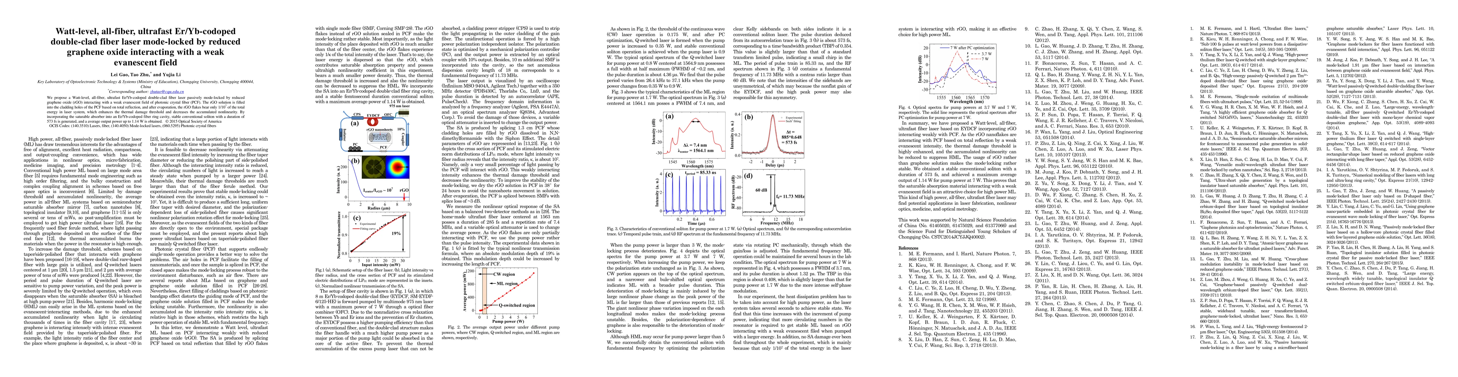 This research proposes a Watt-level, all-fiber, ultrafast Er/Yb-codoped double-clad fiber laser passively mode-locked by reduced graphene oxide (rGO) interacting with a weak evanescent field. The rGO flakes, filling the cladding holes of the photonic crystal fiber, enhance the thermal damage threshold and reduce accumulated nonlinearity, achieving a stable soliton pulse duration of 573 fs and an average output power of 1.14 W.