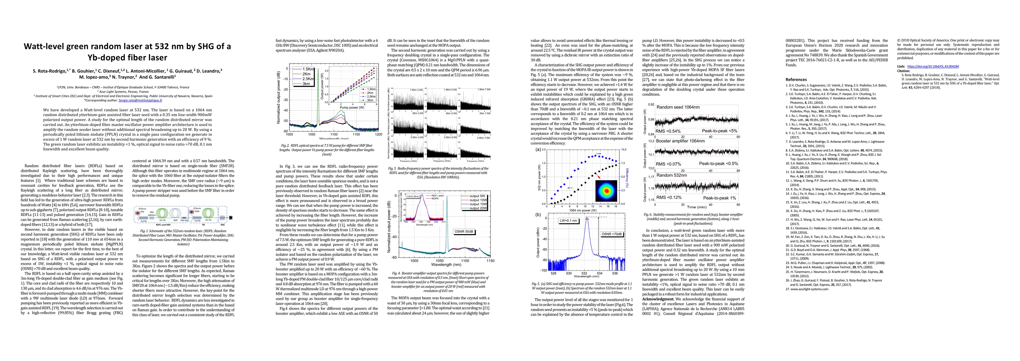 Researchers created a Watt-level green random laser at 532nm using second harmonic generation of a Yb-doped fiber laser seed, achieving >1W output with high stability and beam quality.