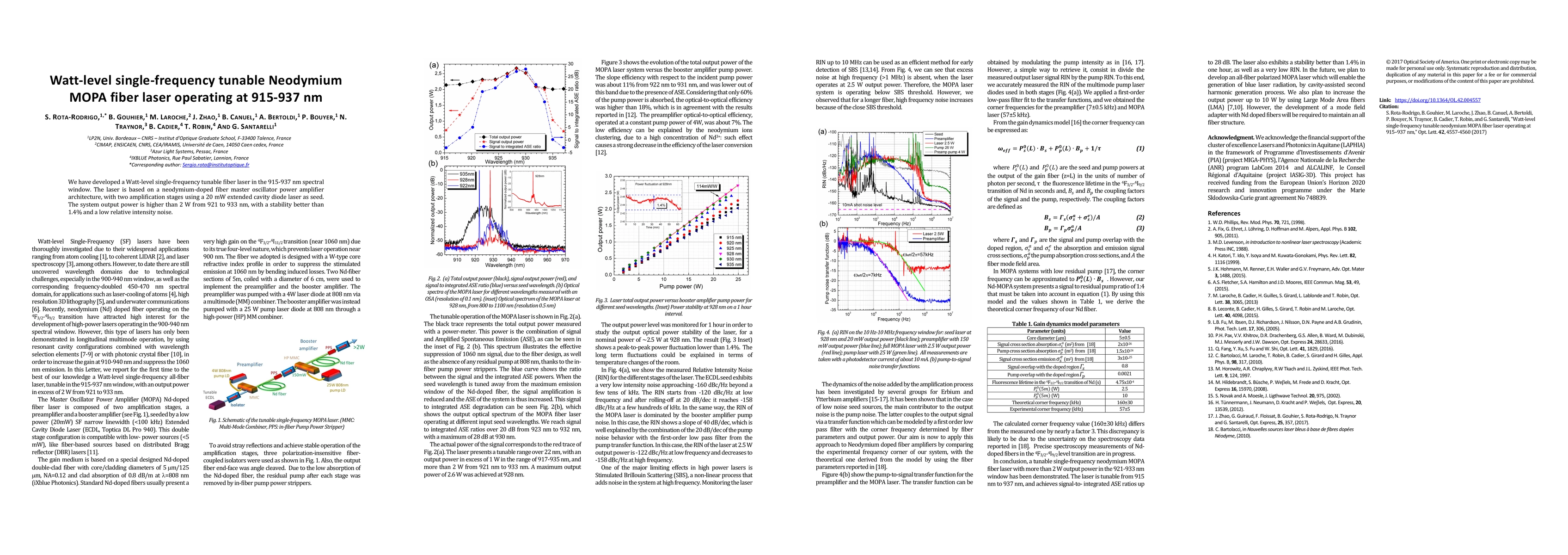 This paper describes a watt-level, single-frequency tunable fiber laser operating in the 915-937 nm range, utilizing a neodymium-doped fiber master oscillator power amplifier (MOPA) architecture. The system achieves an output power of over 2 W with high stability and low relative intensity noise.