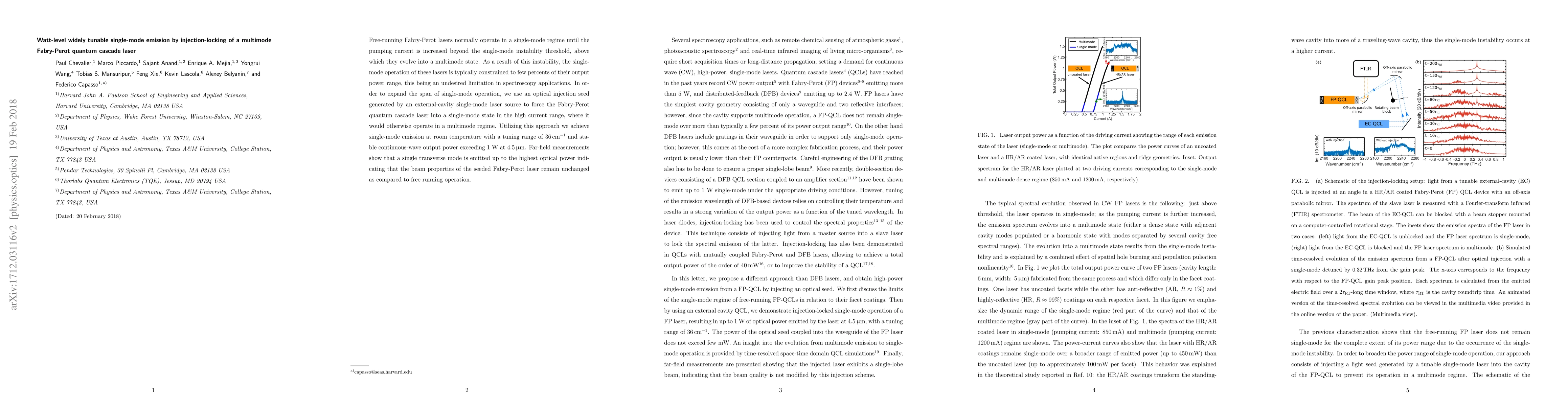 This paper demonstrates a method to extend the single-mode operation of a multimode Fabry-Perot quantum cascade laser through optical injection-locking, achieving over 1 W of stable single-mode emission at room temperature with a tuning range of 36 cm^-1. The technique maintains the laser's beam properties even at high power levels.