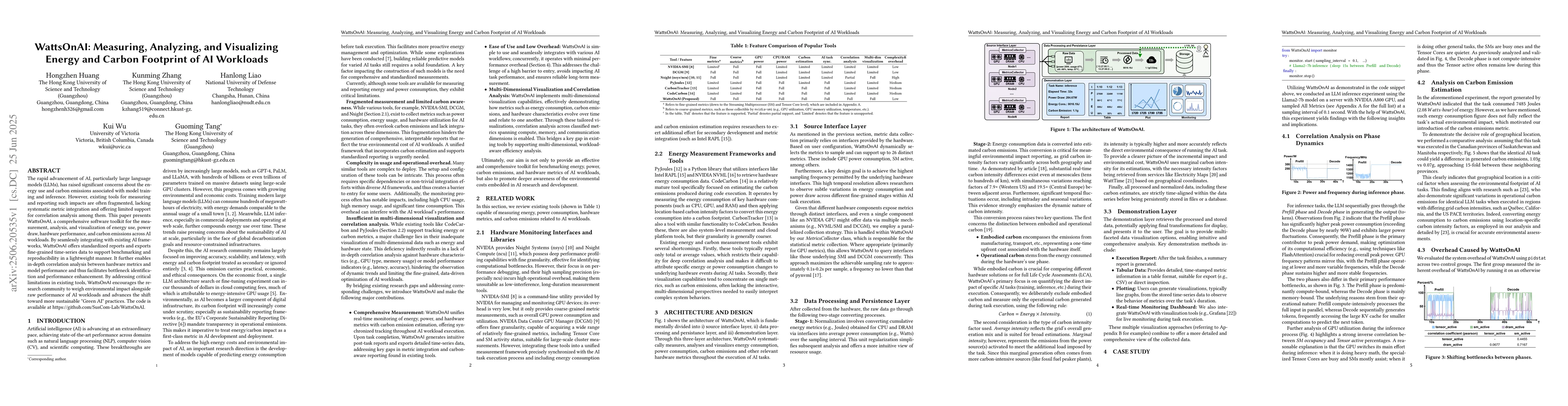 The rapid advancement of AI, particularly large language models (LLMs), has raised significant concerns about the energy use and carbon emissions associated with model training and inference. However, existing tools for measuring and reporting such impacts are often fragmented, lacking systematic metric integration and offering limited support for correlation analysis among them. This paper presents WattsOnAI, a comprehensive software toolkit for the measurement, analysis, and visualization of energy use, power draw, hardware performance, and carbon emissions across AI workloads. By seamlessly integrating with existing AI frameworks, WattsOnAI offers standardized reports and exports fine-grained time-series data to support benchmarking and reproducibility in a lightweight manner. It further enables in-depth correlation analysis between hardware metrics and model performance and thus facilitates bottleneck identification and performance enhancement. By addressing critical limitations in existing tools, WattsOnAI encourages the research community to weigh environmental impact alongside raw performance of AI workloads and advances the shift toward more sustainable "Green AI" practices. The code is available at https://github.com/SusCom-Lab/WattsOnAI.