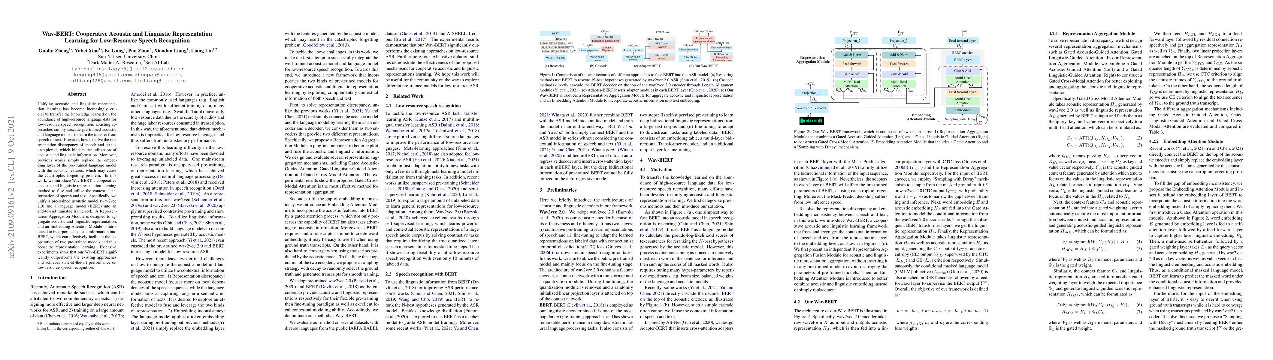 Wav-BERT integrates wav2vec 2.0 and BERT to cooperatively learn acoustic and linguistic representations for low-resource speech recognition, addressing representation discrepancies and mitigating catastrophic forgetting, achieving superior performance.