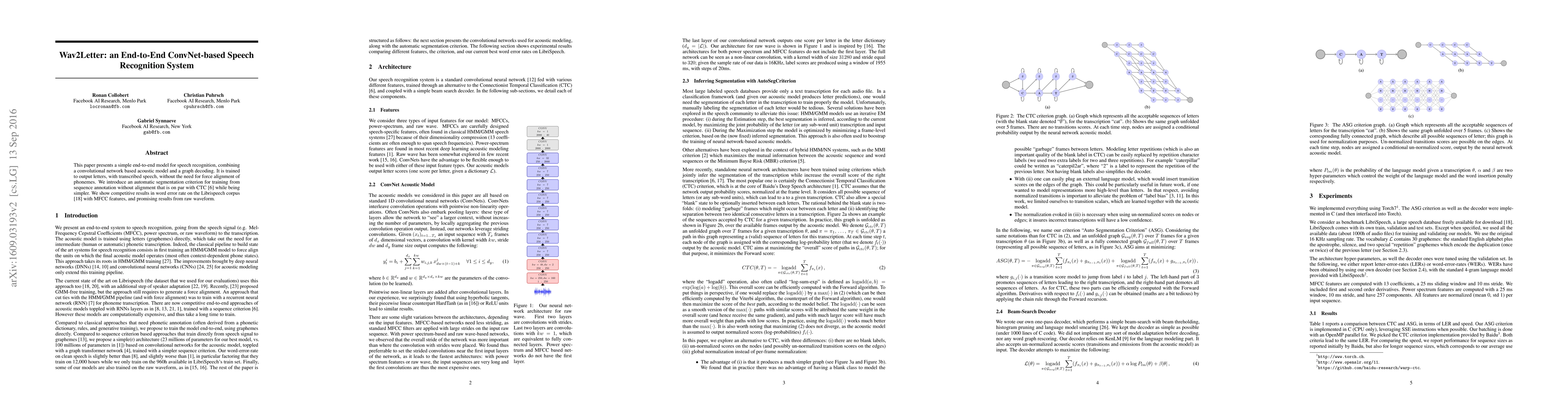 This paper presents a simple end-to-end model for speech recognition, combining a convolutional network based acoustic model and a graph decoding. It is trained to output letters, with transcribed speech, without the need for force alignment of phonemes. We introduce an automatic segmentation criterion for training from sequence annotation without alignment that is on par with CTC while being simpler. We show competitive results in word error rate on the Librispeech corpus with MFCC features, and promising results from raw waveform.